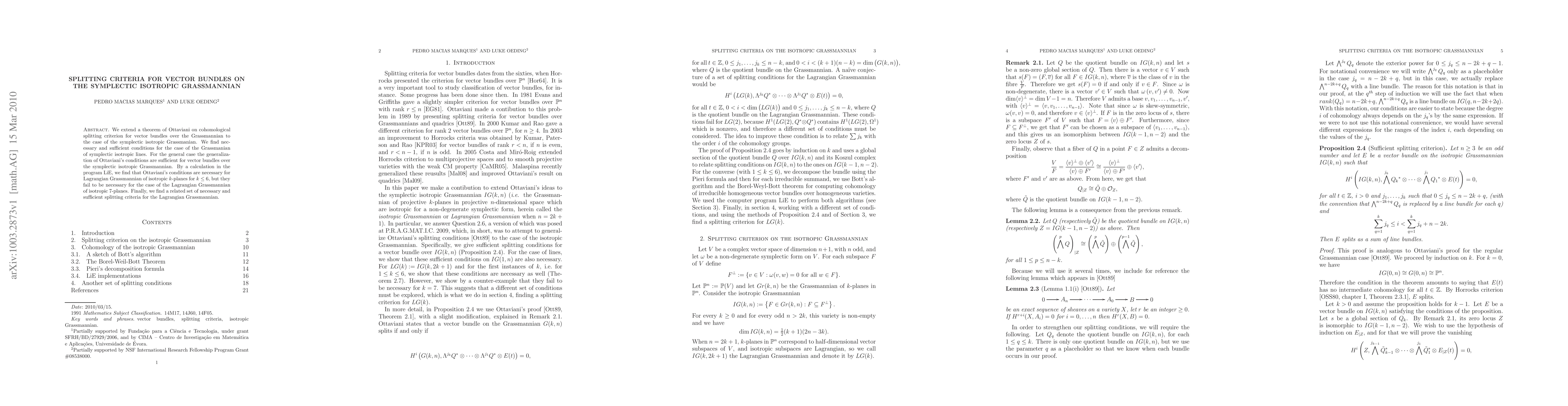 This paper extends Ottaviani's cohomological splitting criterion for vector bundles over the Grassmannian to the symplectic isotropic Grassmannian, providing necessary and sufficient conditions for specific cases. It also finds that Ottaviani's conditions are necessary for lower-dimensional Lagrangian Grassmannians but fail for higher dimensions.