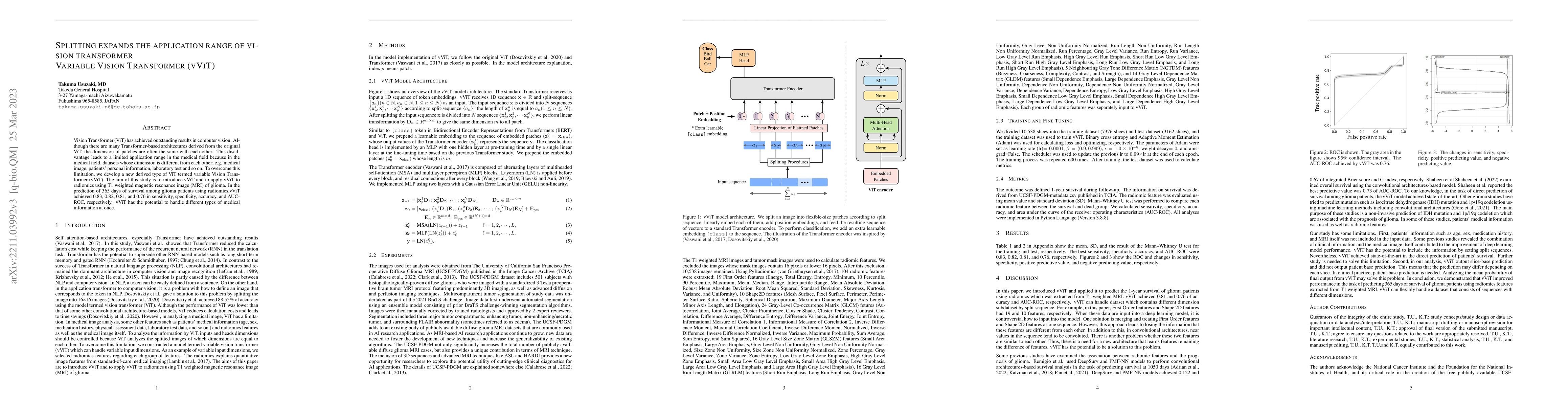 Vision Transformer (ViT) has achieved outstanding results in computer vision. Although there are many Transformer-based architectures derived from the original ViT, the dimension of patches are often the same with each other. This disadvantage leads to a limited application range in the medical field because in the medical field, datasets whose dimension is different from each other; e.g. medical image, patients' personal information, laboratory test and so on. To overcome this limitation, we develop a new derived type of ViT termed variable Vision Transformer (vViT). The aim of this study is to introduce vViT and to apply vViT to radiomics using T1 weighted magnetic resonance image (MRI) of glioma. In the prediction of 365 days of survival among glioma patients using radiomics,vViT achieved 0.83, 0.82, 0.81, and 0.76 in sensitivity, specificity, accuracy, and AUC-ROC, respectively. vViT has the potential to handle different types of medical information at once.
