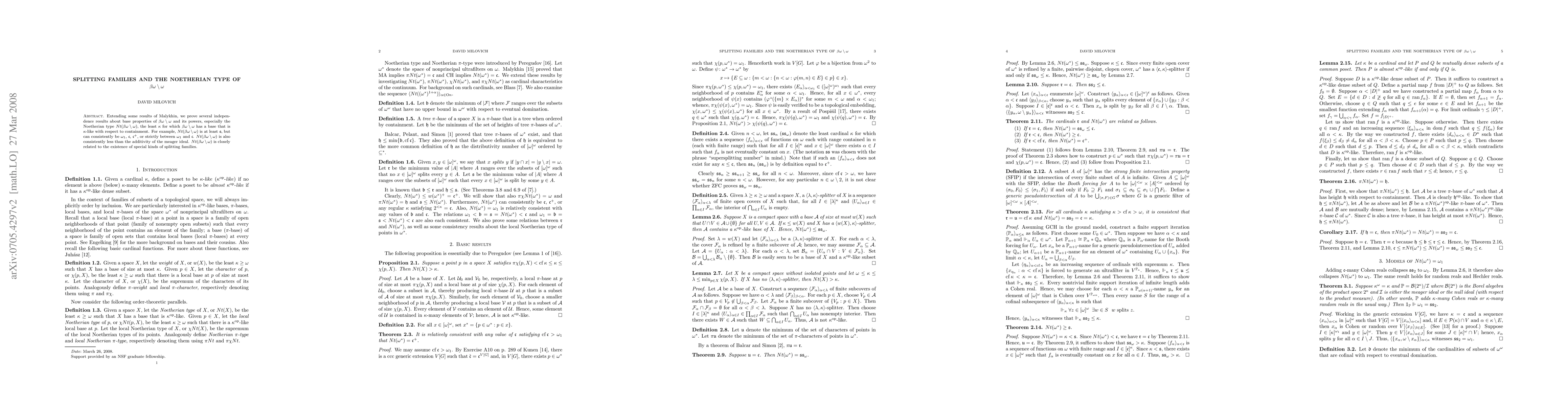 Extending some results of Malykhin, we prove several independence results about base properties of $\beta\omega-\omega$ and its powers, especially the Noetherian type $Nt(\beta\omega-\omega)$, the least $\kappa$ for which $\beta\omega-\omega$ has a base that is $\kappa$-like with respect to containment. For example, $Nt(\beta\omega-\omega)$ is never less than the splitting number, but can consistently be that $\omega_1$, $2^\omega$, $(2^\omega)^+$, or strictly between $\omega_1$ and $2^\omega$. $Nt(\beta\omega-\omega)$ is also consistently less than the additivity of the meager ideal. $Nt(\beta\omega-\omega)$ is closely related to the existence of special kinds of splitting families.