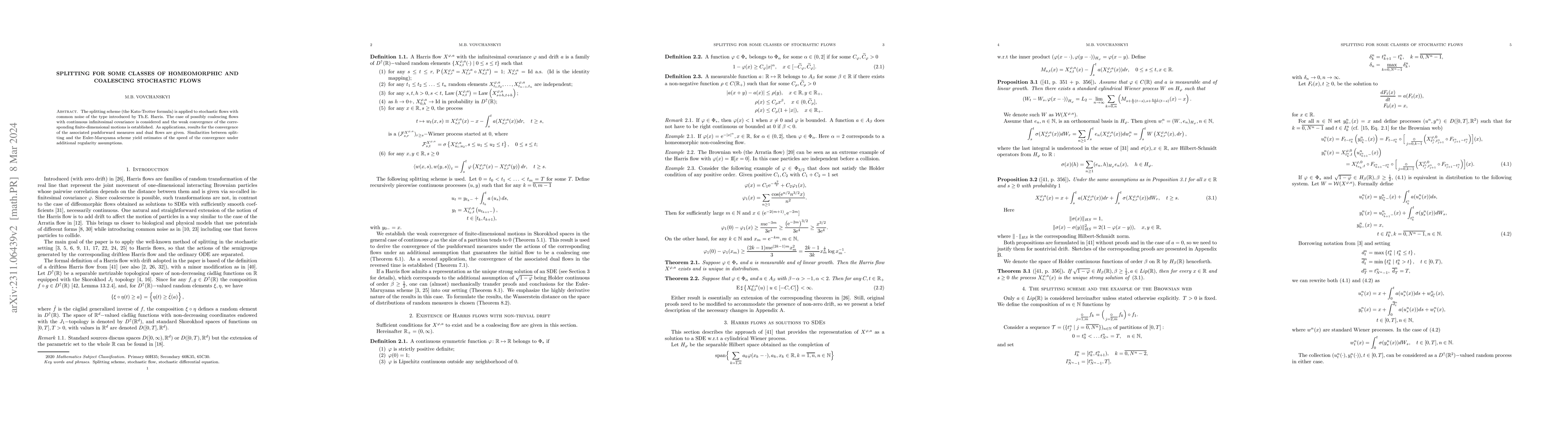 The splitting scheme (the Kato-Trotter formula) is applied to stochastic flows with common noise of the type introduced by Th.E.~Harris. The case of possibly coalescing flows with continuous infinitesimal covariance is considered and the weak convergence of the corresponding finite-dimensional motions is established. As applications, results for the convergence of the associated pushforward measures and dual flows are given. Similarities between splitting and the Euler-Maruyama scheme yield estimates of the speed of the convergence under additional regularity assumptions.