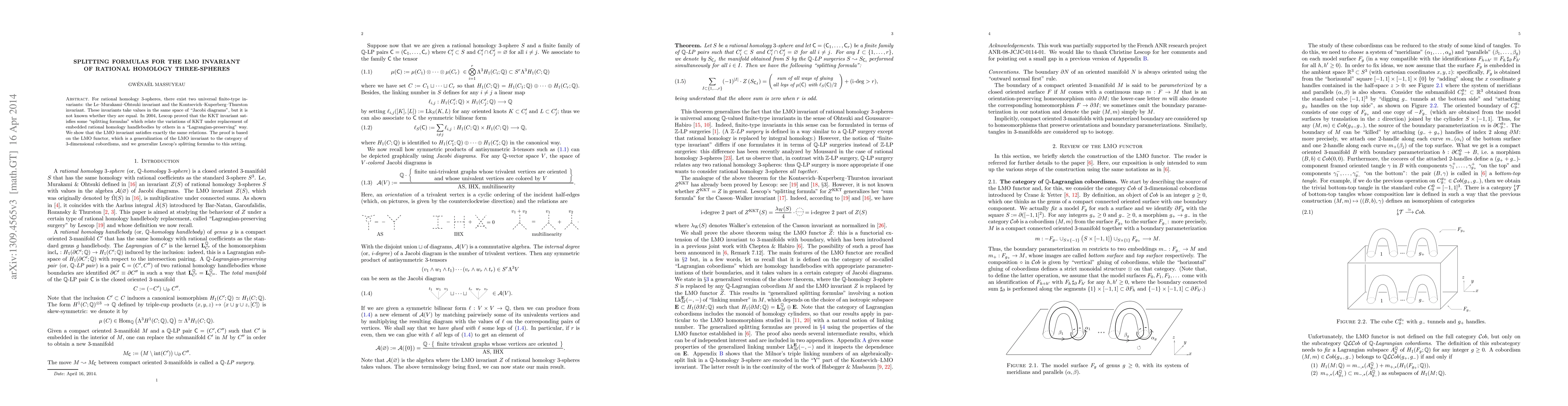 For rational homology 3-spheres, there exist two universal finite-type invariants: the Le-Murakami-Ohtsuki invariant and the Kontsevich-Kuperberg-Thurston invariant. These invariants take values in the same space of "Jacobi diagrams", but it is not known whether they are equal. In 2004, Lescop proved that the KKT invariant satisfies some "splitting formulas" which relate the variations of KKT under replacement of embedded rational homology handlebodies by others in a "Lagrangian-preserving" way. We show that the LMO invariant satisfies exactly the same relations. The proof is based on the LMO functor, which is a generalization of the LMO invariant to the category of 3-dimensional cobordisms, and we generalize Lescop's splitting formulas to this setting.