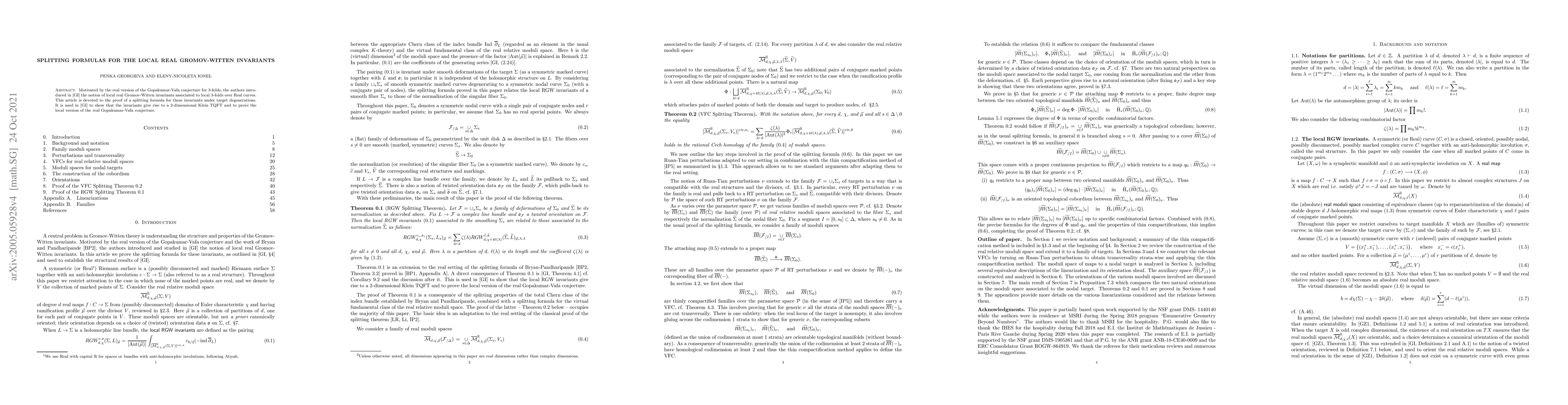 This paper proves a splitting formula for local real Gromov-Witten invariants associated with local 3-folds over real curves, which is utilized to establish a 2-dimensional Klein TQFT and verify the local real Gopakumar-Vafa conjecture.
