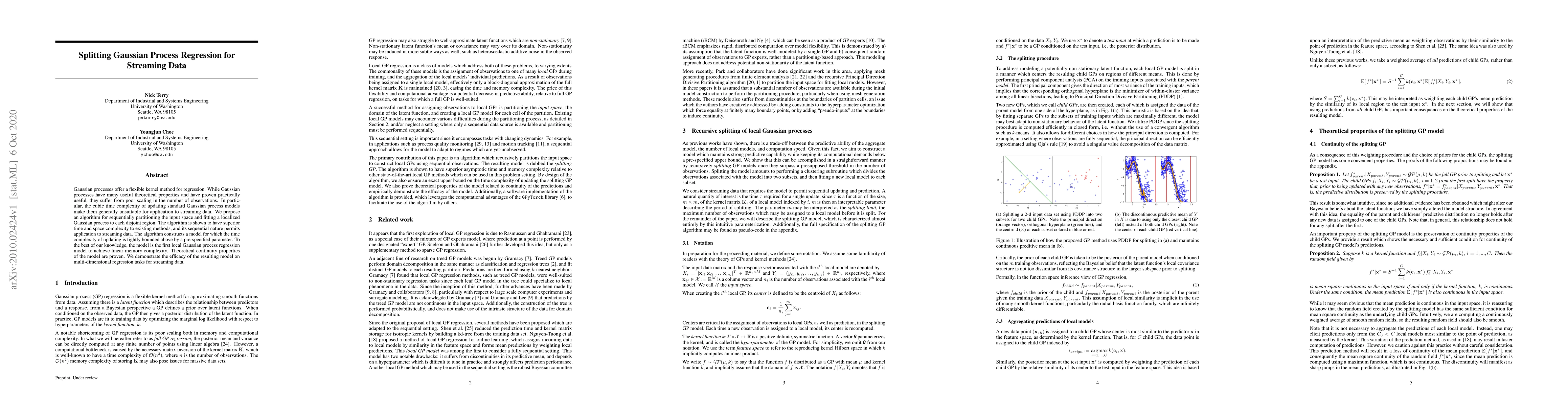 This paper proposes a novel algorithm for Gaussian process regression that sequentially partitions the input space and fits localized models to each region, achieving linear memory complexity and superior time complexity for streaming data. The method maintains theoretical continuity properties and demonstrates effectiveness on multi-dimensional regression tasks.