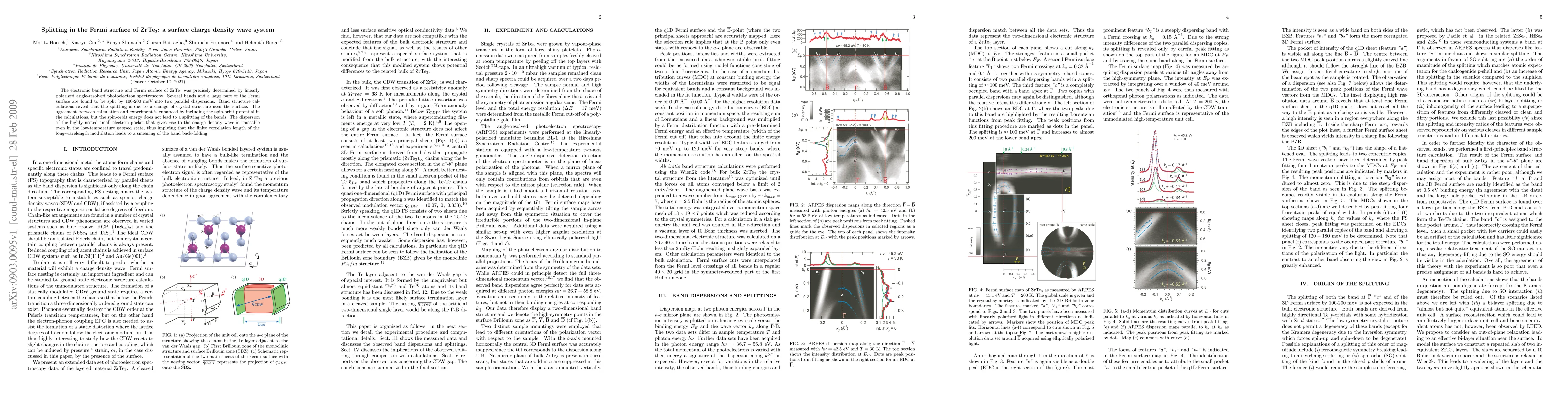 This study reveals that the Fermi surface of ZrTe_3 exhibits splitting into two parallel dispersions due to a surface charge density wave, identified via angle-resolved photoelectron spectroscopy. The splitting is attributed to a structural change near the surface, with spin-orbit potential enhancing calculation accuracy but not causing band splitting.