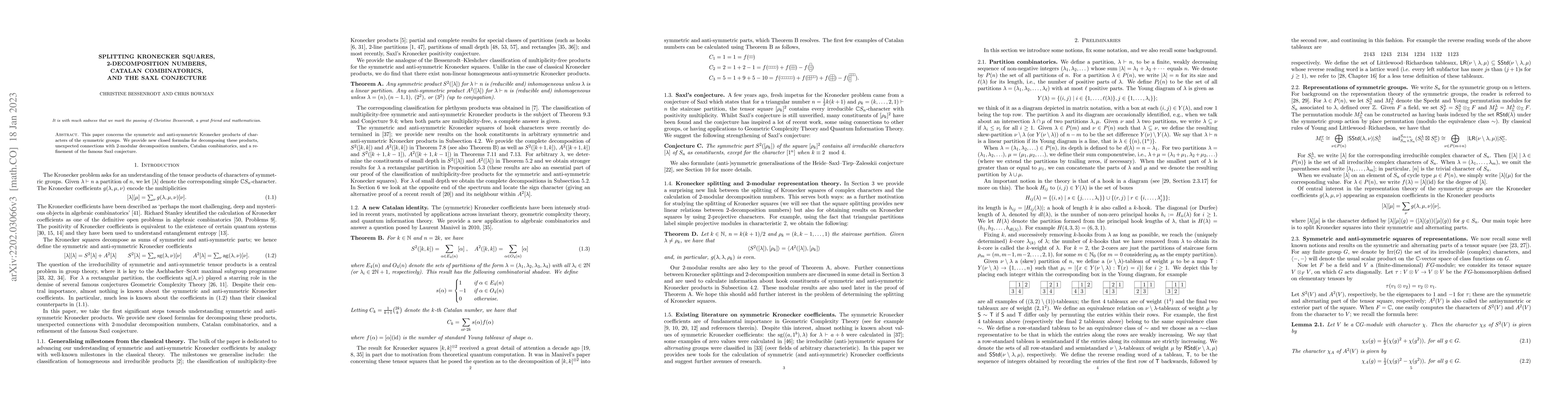 This paper explores new results and conjectures regarding the decomposition of Kronecker squares of symmetric groups, contributing to a deeper understanding of their structure. It also discusses connections to 2-modular decomposition numbers, Catalan combinatorics, and the Saxl conjecture, motivating further research in these areas.