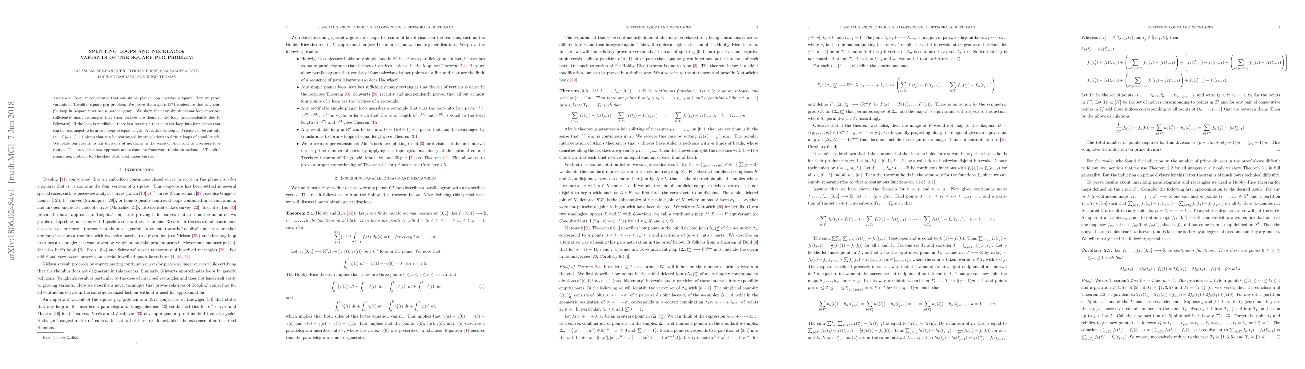 Toeplitz conjectured that any simple planar loop inscribes a square. Here we prove variants of Toeplitz' square peg problem. We prove Hadwiger's 1971 conjecture that any simple loop in $3$-space inscribes a parallelogram. We show that any simple planar loop inscribes sufficiently many rectangles that their vertices are dense in the loop (independently due to Schwartz). If the loop is rectifiable, there is a rectangle that cuts the loop into four pieces that can be rearranged to form two loops of equal length. A rectifiable loop in $d$-space can be cut into $(r-1)(d+1)+1$ pieces that can be rearranged by translations to form $r$ loops of equal length. We relate our results to fair divisions of necklaces in the sense of Alon and to Tverberg-type results. This provides a new approach and a common framework to obtain variants of Toeplitz' square peg problem for the class of all continuous curves.