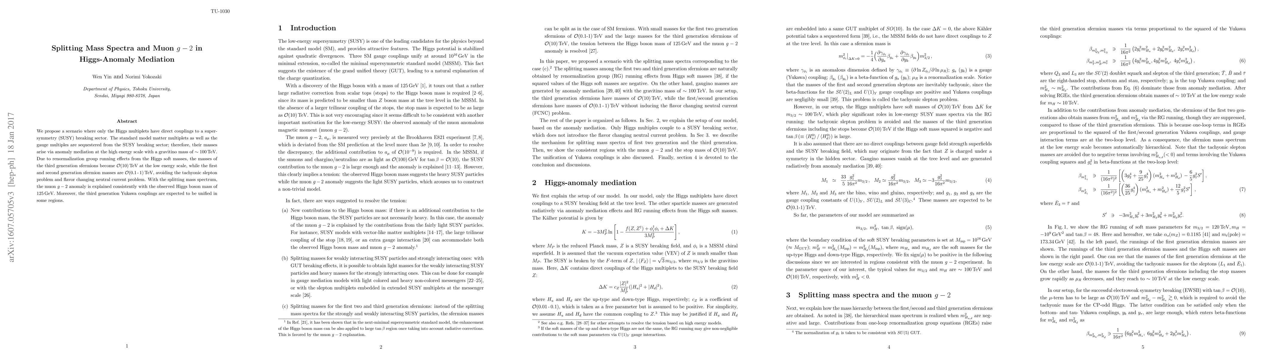 We propose a scenario where only the Higgs multiplets have direct couplings to a supersymmetry (SUSY) breaking sector. The standard model matter multiplets as well as the gauge multiples are sequestered from the SUSY breaking sector; therefore, their masses arise via anomaly mediation at the high energy scale with a gravitino mass of $\sim$100 TeV. Due to renormalization group running effects from the Higgs soft masses, the masses of the third generation sfermions become O(10) TeV at the low energy scale, while the first and second generation sfermion masses are O(0.1-1) TeV, avoiding the tachyonic slepton problem and flavor changing neutral current problem. With the splitting mass spectrum, the muon g-2 anomaly is explained consistently with the observed Higgs boson mass of 125 GeV. Moreover, the third generation Yukawa couplings are expected to be unified in some regions.
