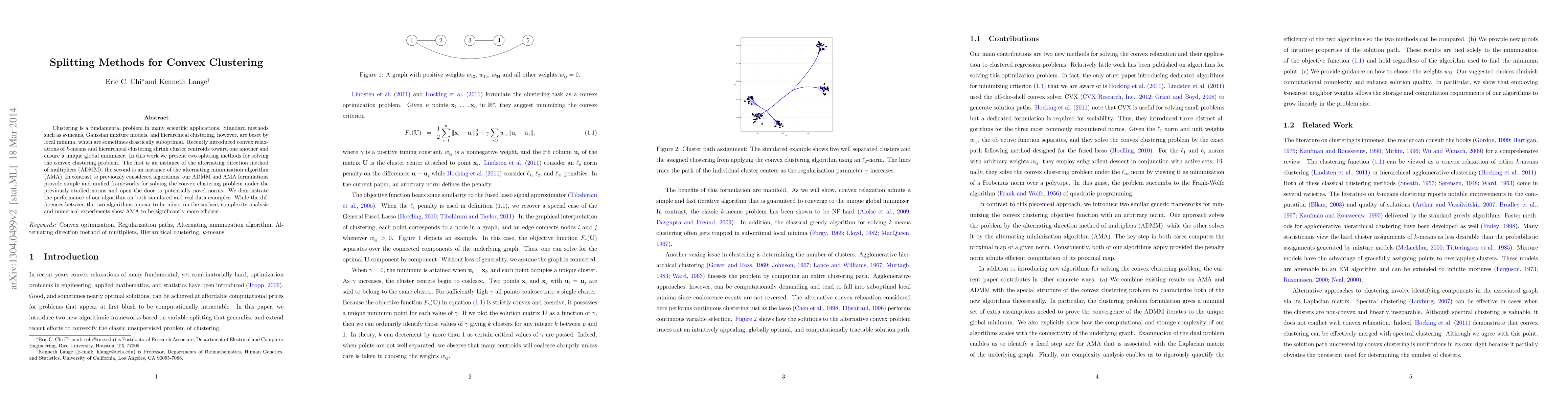 This paper introduces two new splitting methods—ADMM and AMA—for solving convex clustering problems, which offer a unified framework for addressing the issue of local minima in traditional clustering methods. The authors demonstrate that while both methods perform similarly, the AMA method is significantly more efficient.
