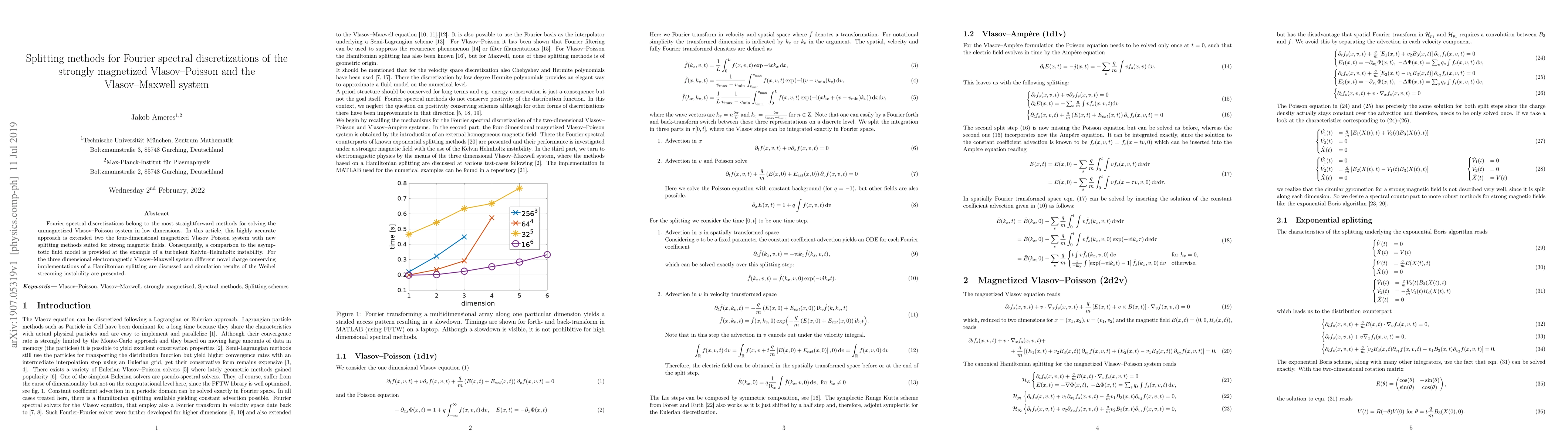 Fourier spectral discretizations belong to the most straightforward methods for solving the unmagnetized Vlasov--Poisson system in low dimensions. In this article, this highly accurate approach is extended two the four-dimensional magnetized Vlasov--Poisson system with new splitting methods suited for strong magnetic fields. Consequently, a comparison to the asymptotic fluid model is provided at the example of a turbulent Kelvin--Helmholtz instability. For the three dimensional electromagnetic Vlasov--Maxwell system different novel charge conserving implementations of a Hamiltonian splitting are discussed and simulation results of the Weibel streaming instability are presented.