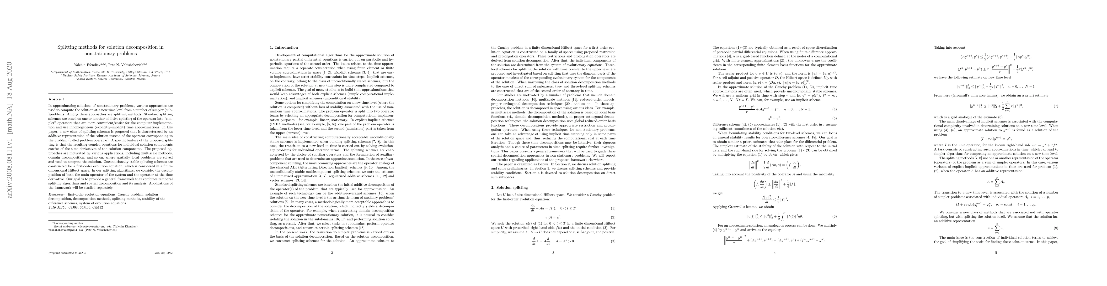 This paper introduces a novel class of splitting schemes for solving nonstationary problems by decomposing the solution rather than the operator, resulting in coupled equations involving time derivatives of solution components. The proposed unconditionally stable splitting methods are designed for first-order evolution equations in finite-dimensional Hilbert spaces, aiming to combine temporal splitting and spatial decomposition.