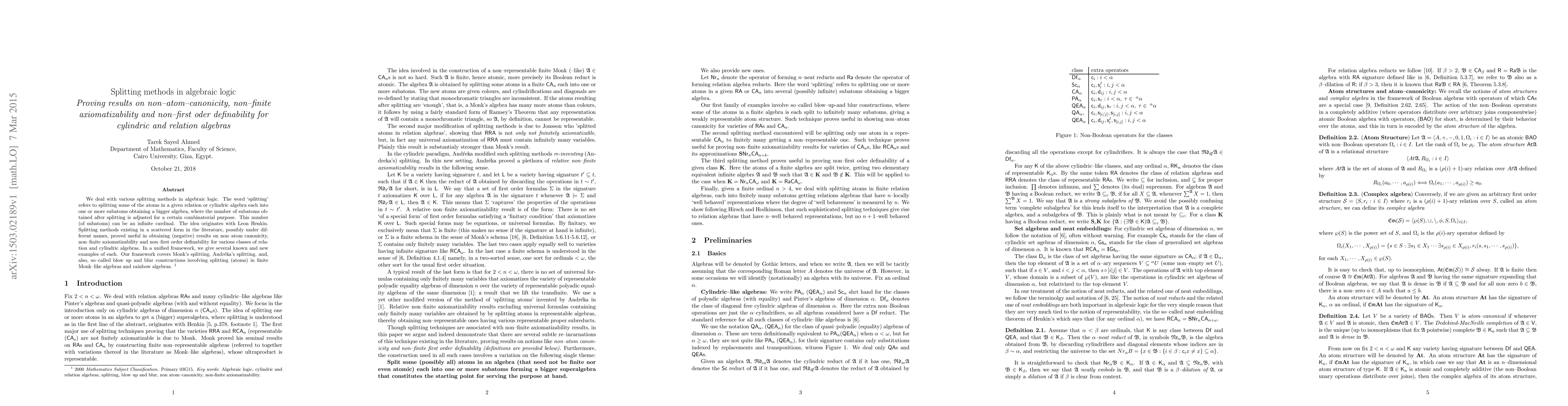 This paper explores various splitting methods in algebraic logic to demonstrate negative results on non-atom canonicity, non-finite axiomatizability, and non-first order definability for cylindric and relation algebras. The study unifies different splitting techniques, including Monk's and Andr\'eka's, to provide new and known examples.