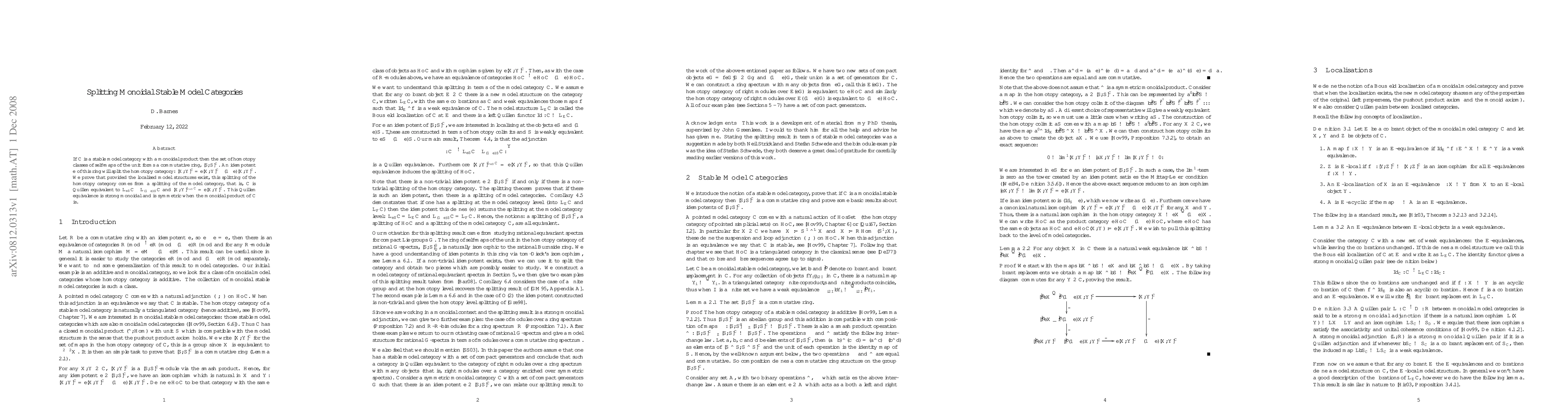 If C is a stable model category with a monoidal product then the set of homotopy classes of self-maps of the unit S forms a commutative ring. An idempotent e of this ring will split the homotopy category. We prove that provided the localised model structures exist, this splitting of the homotopy category comes from a splitting of the model category, that is, C is Quillen equivalent to the product of C localised at the object eS and C localised at the object (1-e)S. This Quillen equivalence is strong monoidal and is symmetric when the monoidal product of C is.