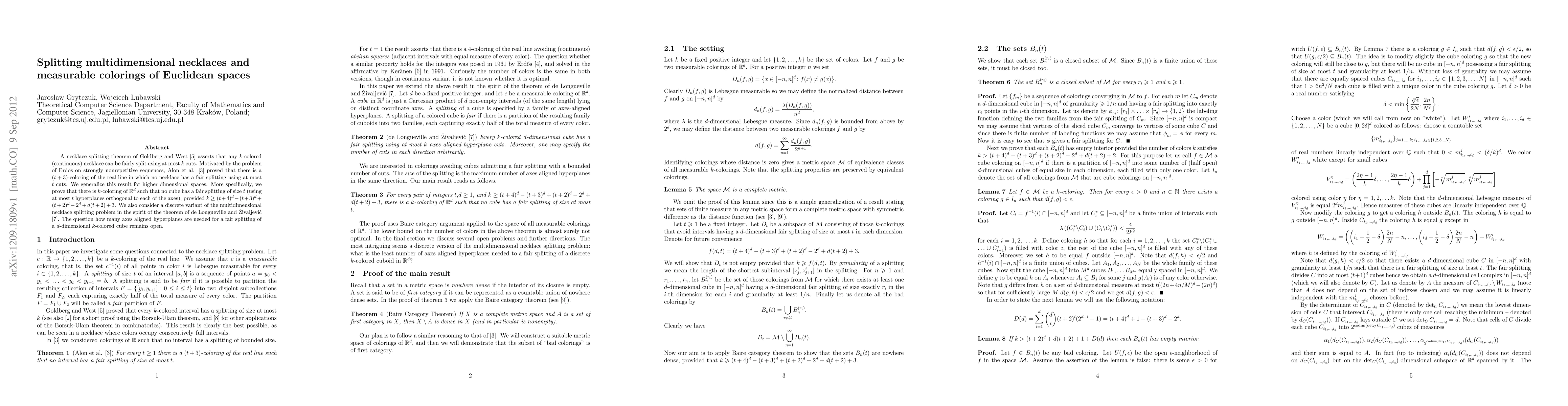 Researchers prove a multidimensional necklace splitting theorem for higher-dimensional spaces, showing that certain colorings prevent fair splits using at most t cuts.