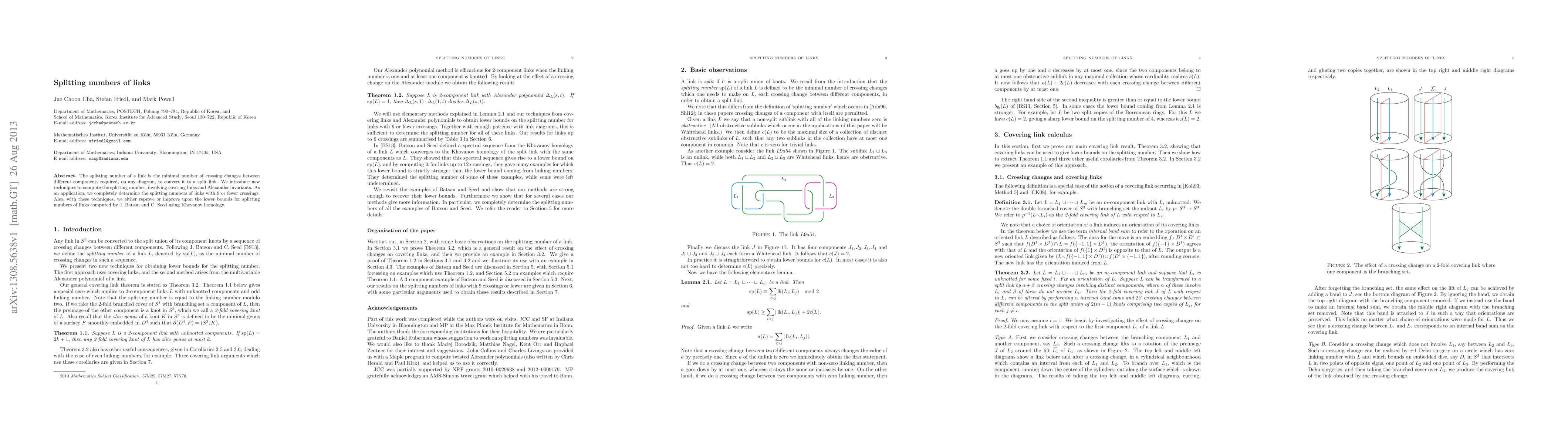 The splitting number of a link is the minimal number of crossing changes between different components required, on any diagram, to convert it to a split link. We introduce new techniques to compute the splitting number, involving covering links and Alexander invariants. As an application, we completely determine the splitting numbers of links with 9 or fewer crossings. Also, with these techniques, we either reprove or improve upon the lower bounds for splitting numbers of links computed by J. Batson and C. Seed using Khovanov homology.