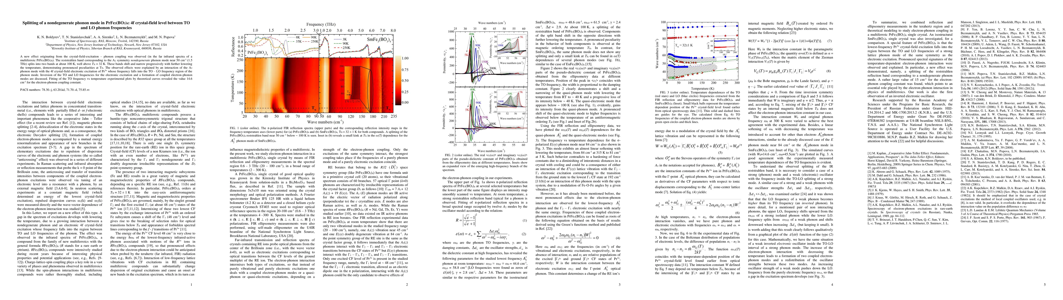 A new effect originating from the crystal-field-excitation - phonon coupling was observed (in the far infrared spectra of a multiferroic PrFe3(BO3)4). The reststrahlen band corresponding to the A2 symmetry nondegenerate phonon mode near 50 cm-1 (1.5 THz) splits into two bands at about 100 K, well above TN = 32 K. These bands shift and narrow progressively with further lowering the temperature, demonstrating pronounced peculiarities at TN. The observed effects were explained by an interaction of the A2 phonon mode with the 4f crystal-field electronic excitation of Pr3+ whose frequency falls into the TO - LO frequency region of the phonon mode. Inversion of the TO and LO frequencies for the electronic excitation and a formation of coupled electron-phonon modes are discussed. Fitting of the TO frequency vs temperature experimental plots by theoretical curves revealed the value 14.6 cm-1 for the electron-phonon coupling constant.