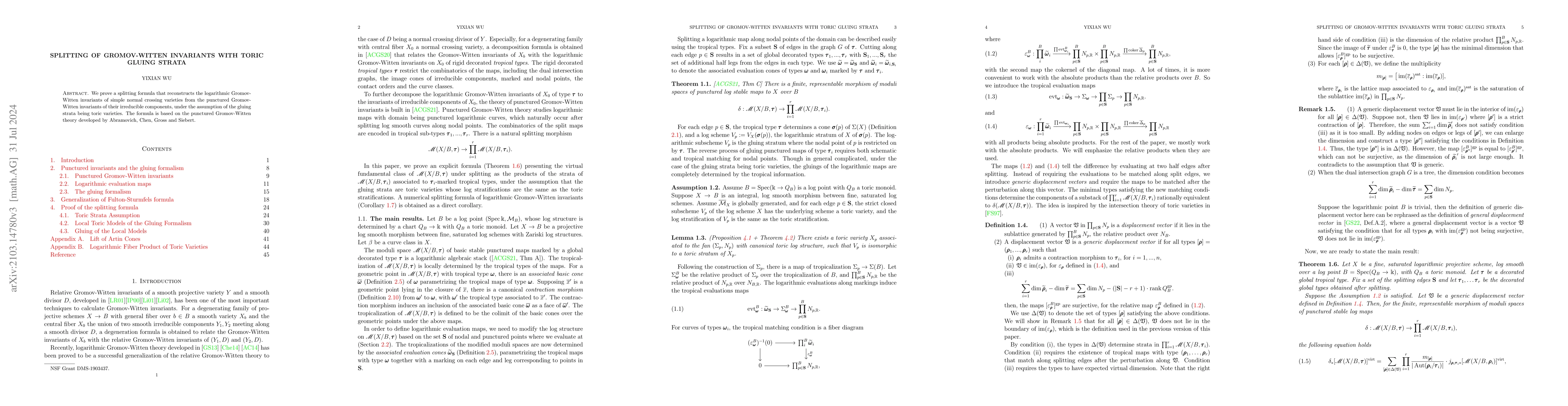 The paper proves a splitting formula that reconstructs logarithmic Gromov-Witten invariants of simple normal crossing varieties from punctured invariants of their components, assuming the gluing strata are toric varieties. The result relies on punctured Gromov-Witten theory developed in a referenced arXiv paper.