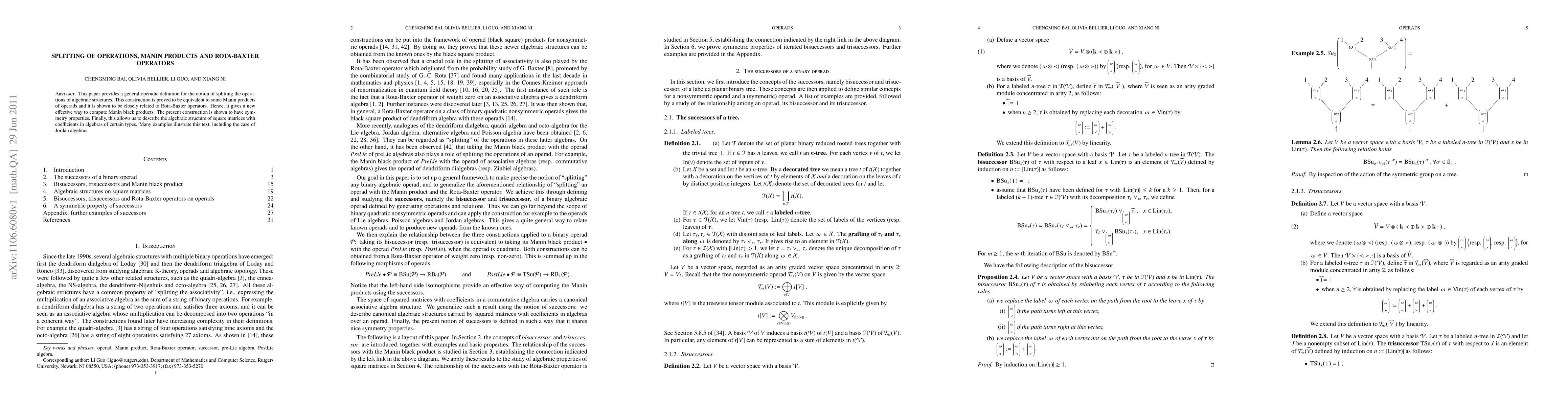 This paper introduces an operadic definition for splitting operations in algebraic structures, demonstrating its equivalence to Manin products of operads and its relation to Rota-Baxter operators, thereby providing a new method for computing Manin products with symmetry properties. It also illustrates applications in describing the algebraic structure of square matrices in specific algebras, exemplified by Jordan algebras.