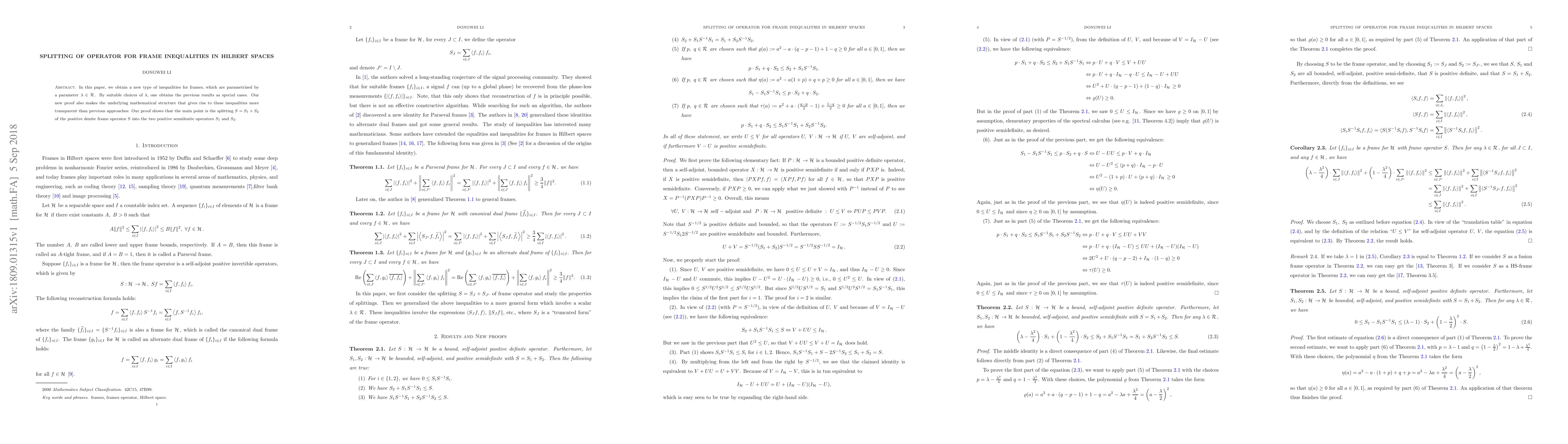 This research introduces new frame inequalities in Hilbert spaces, parameterized by lambda. The key method involves splitting the frame operator S into two positive semidefinite operators S1 and S2, revealing underlying mathematical structure and encompassing previous results as special cases.