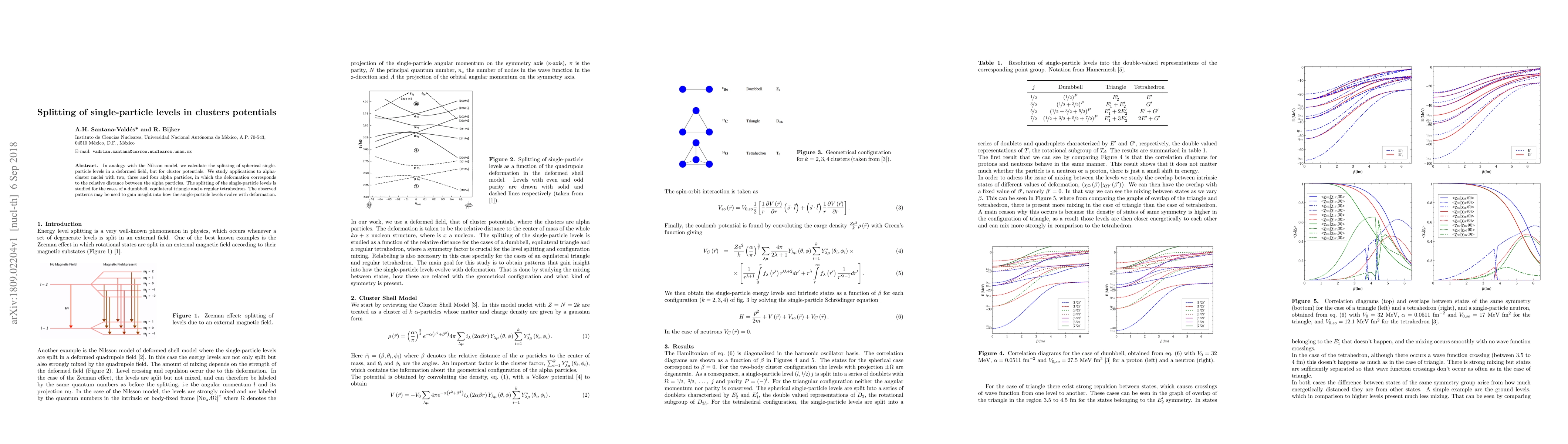 This paper investigates the splitting of spherical single-particle levels in deformed cluster potentials, analogous to the Nilsson model, focusing on alpha-cluster nuclei. It examines the effects of different geometric configurations, such as dumbbells, triangles, and tetrahedra, to understand the evolution of single-particle levels with deformation.