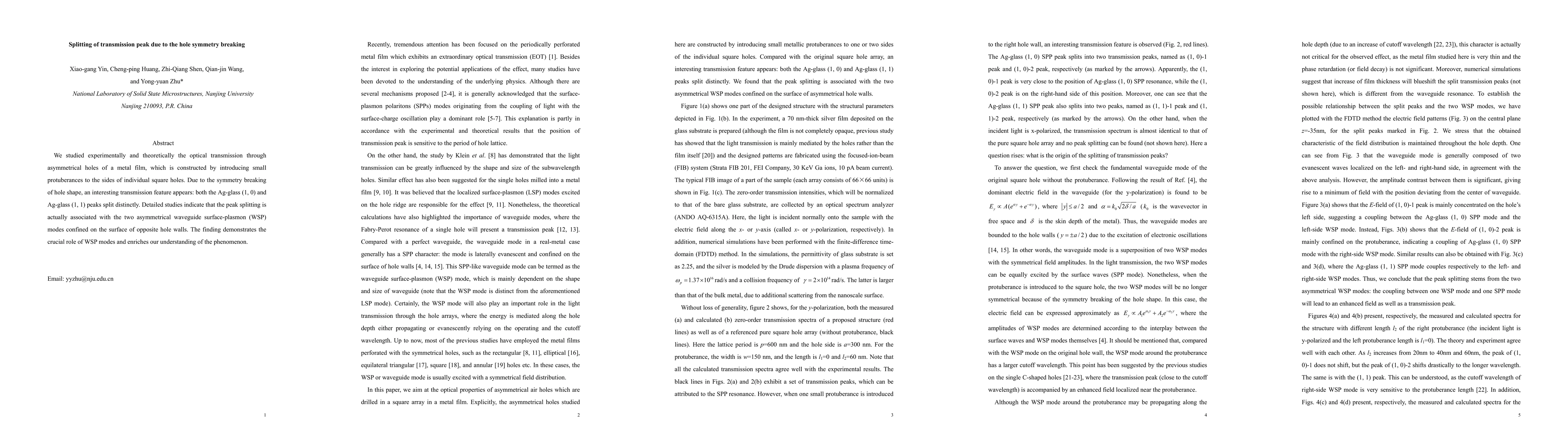 Researchers found that asymmetrical holes in a metal film create two distinct peaks in optical transmission, attributed to different waveguide surface-plasmon modes confined on opposite hole walls.
