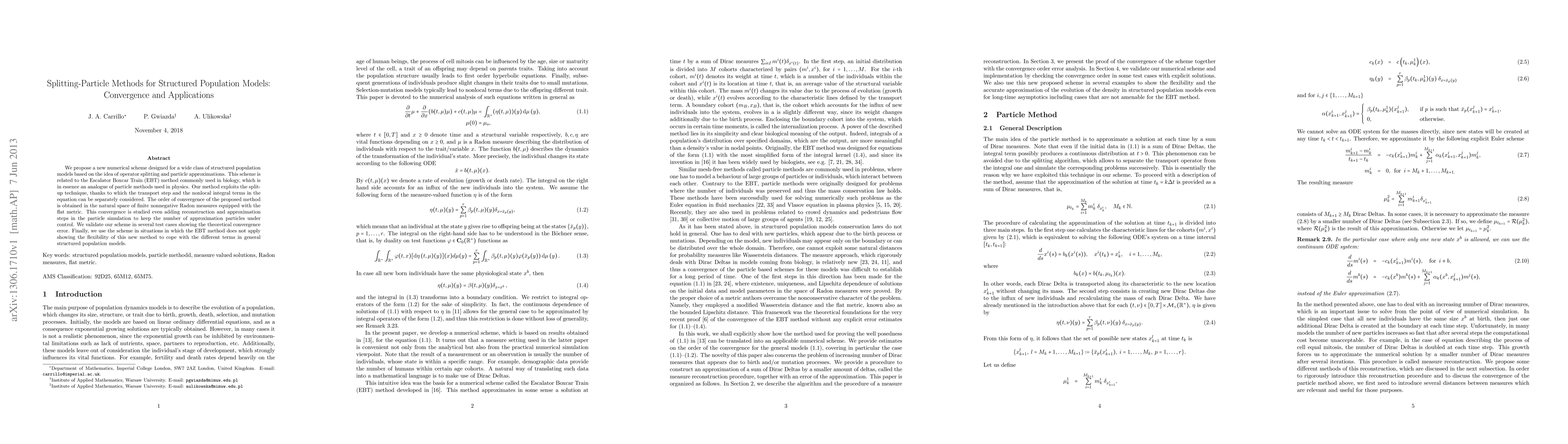 This paper introduces a novel numerical scheme for structured population models using operator splitting and particle approximations, demonstrating convergence in the space of finite nonnegative Radon measures. The method is validated through various test cases and shown to be flexible for scenarios where traditional methods like the Escalator Boxcar Train (EBT) method fail.