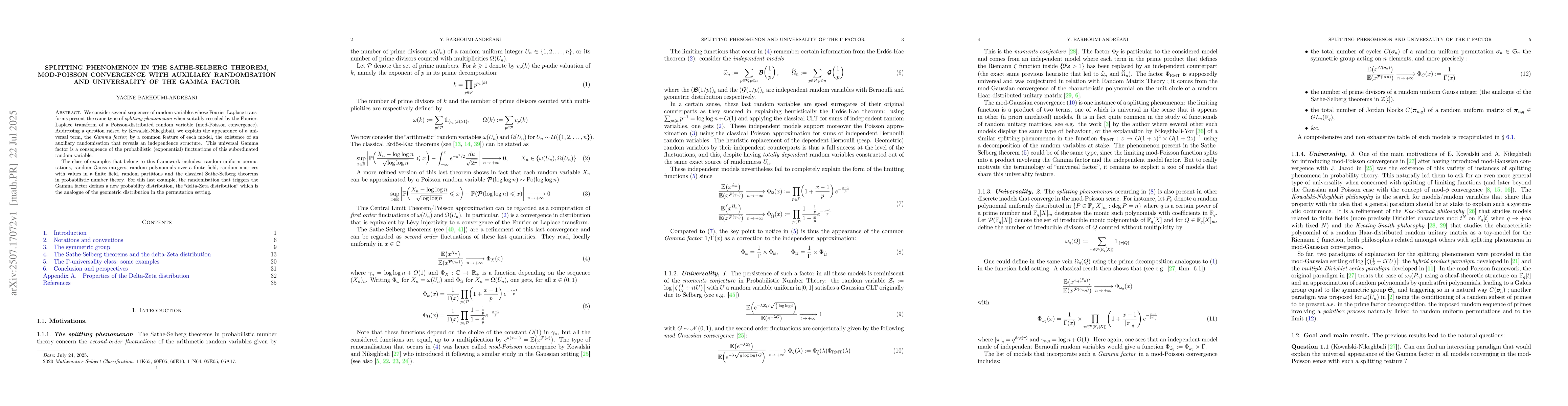 We consider several sequences of random variables whose Fourier-Laplace transforms present the same type of \textit{splitting phenomenon} when suitably rescaled by the Fourier-Laplace transform of a Poisson-distributed random variable (mod-Poisson convergence). Addressing a question raised by Kowalski-Nikeghbali, we explain the appearance of a universal term, the \textit{Gamma factor}, by a common feature of each model, the existence of an auxiliary randomisation that reveals an independence structure. This universal Gamma factor is a consequence of the probabilistic (exponential) fluctuations of this subordinated random variable. The class of examples that belong to this framework includes: random uniform permutations, random Gauss integers, random polynomials over a finite field, random matrices with values in a finite field, random partitions and the classical Sathe-Selberg theorems in probabilistic number theory. For this last example, the randomisation that triggers the Gamma factor defines a new probability distribution, the ``delta-Zeta distribution'' which is the analogue of the geometric distribution in the permutation setting.