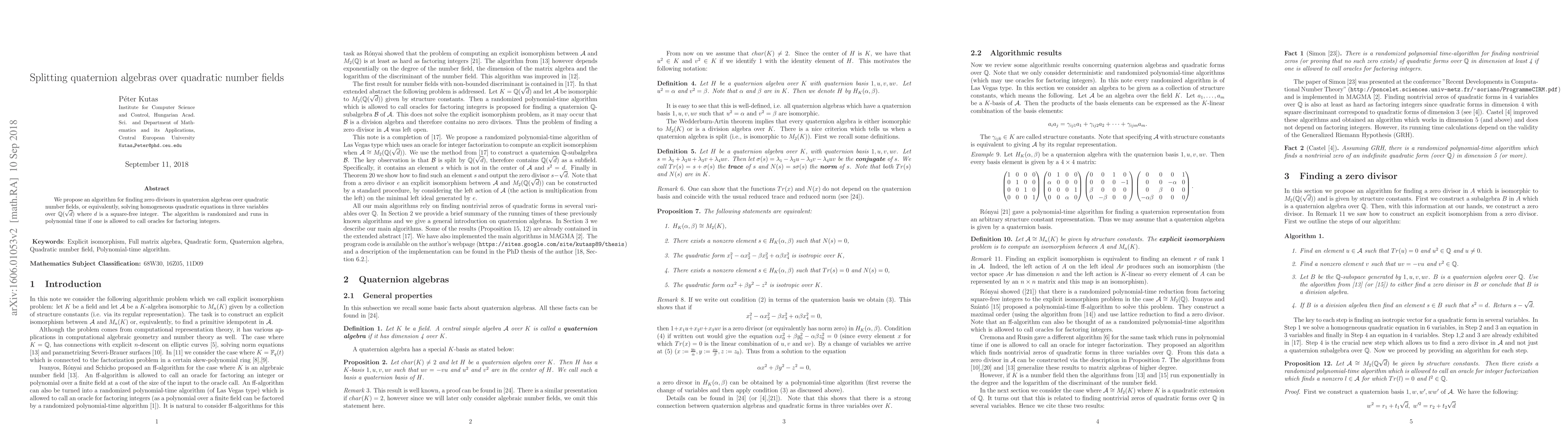 The paper presents a randomized algorithm for finding zero divisors in quaternion algebras over quadratic number fields, equivalently solving homogeneous quadratic equations in three variables over $\mathbb{Q}(\sqrt{d})$. The algorithm operates in polynomial time with integer factorization oracles.