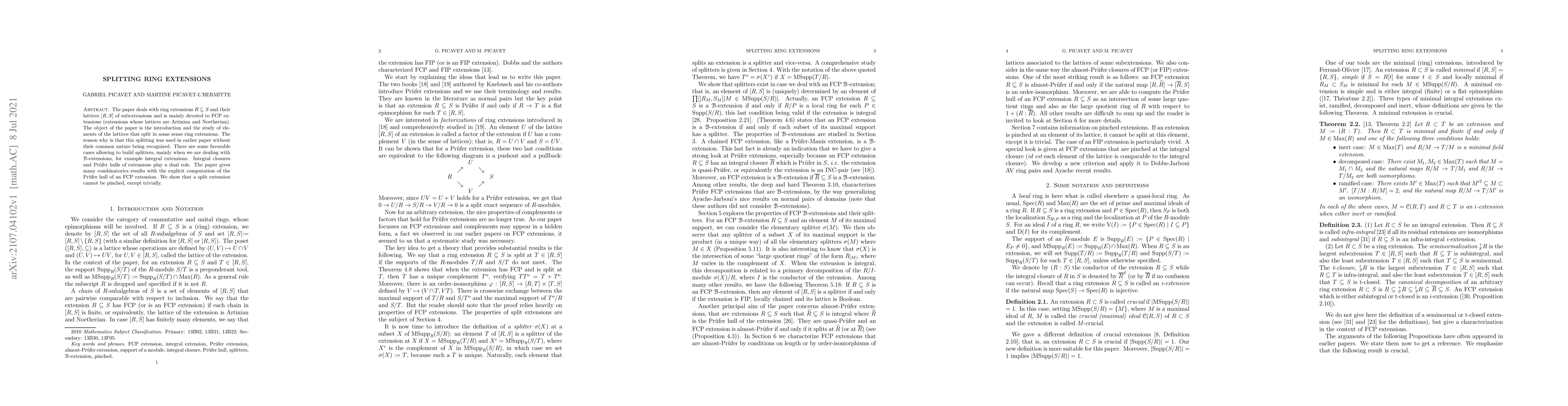 The paper deals with ring extensions $R\subseteq S$ and their lattices $[R,S]$ of subextensions and is mainly devoted to FCP extensions (extensions whose lattices are Artinian and Noetherian). The object of the paper is the introduction and the study of elements of the lattices that split in some sense ring extensions. The reason why is that this splitting was used in earlier paper without their common nature being recognized. There are some favorable cases allowing to build splitters, mainly when we are dealing with $\mathcal B$-extensions, for example integral extensions. Integral closures and Prufer hulls of extensions play a dual role. The paper gives many combinatorics results with the explicit computation of the Prufer hull of an FCP extension. We show that a split extension cannot be pinched, except trivially.