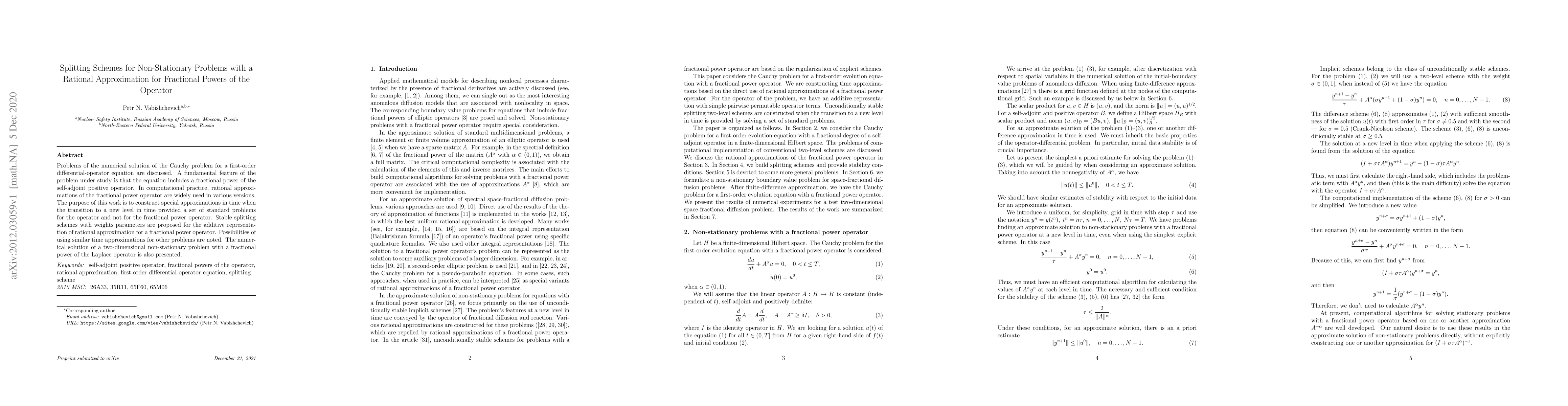This paper proposes stable splitting schemes with weight parameters for solving the Cauchy problem of a first-order differential-operator equation involving fractional powers of a self-adjoint operator. It introduces rational approximations for these fractional powers and demonstrates their application to a two-dimensional non-stationary problem.