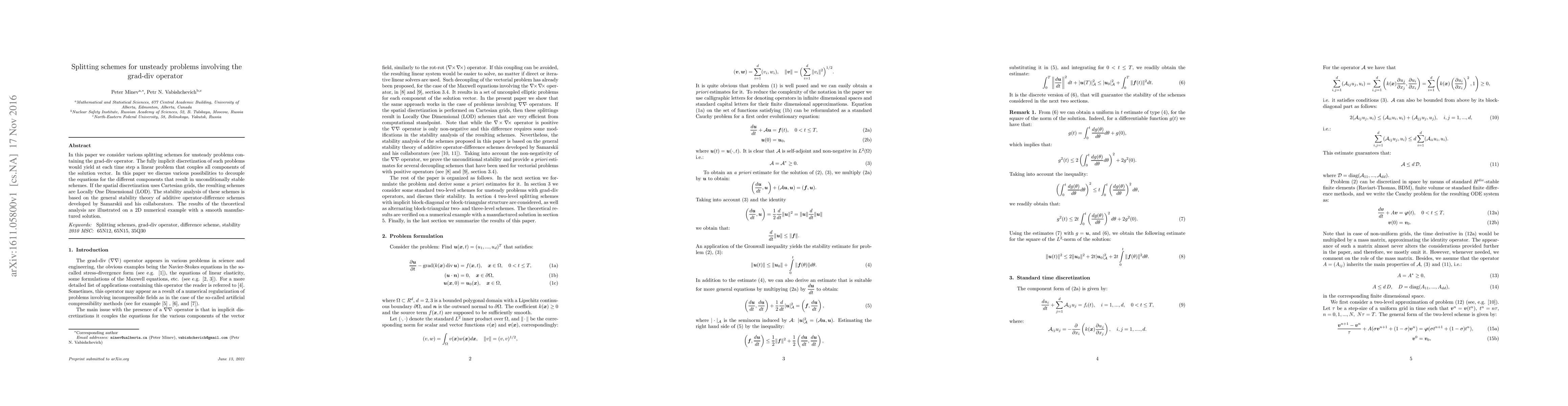 This paper explores splitting schemes for unsteady problems featuring the grad-div operator, proposing methods to decouple the equations and achieve unconditionally stable schemes. The stability analysis leverages Samarskii's additive operator-difference scheme theory, and results are demonstrated through a 2D numerical example.