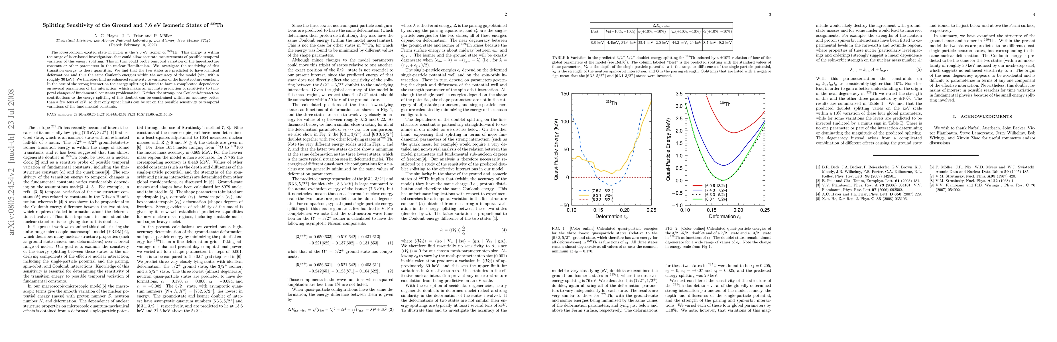 The lowest-known excited state in nuclei is the 7.6 eV isomer of 229Th. This energy is within the range of laser-based investigations that could allow accurate measurements of possible temporal variation of this energy splitting. This in turn could probe temporal variation of the fine-structure constant or other parameters in the nuclear Hamiltonian. We investigate the sensitivity of this transition energy to these quantities. We find that the two states are predicted to have identical deformations and thus the same Coulomb energies within the accuracy of the model (viz., within roughly 30 keV). We therefore find no enhanced sensitivity to variation of the fine-structure constant. In the case of the strong interaction the energy splitting is found to have a complicated dependence on several parameters of the interaction, which makes an accurate prediction of sensitivity to temporal changes of fundamental constants problematical. Neither the strong- nor Coulomb-interaction contributions to the energy splitting of this doublet can be constrained within an accuracy better than a few tens of keV, so that only upper limits can be set on the possible sensitivity to temporal variations of the fundamental constants.