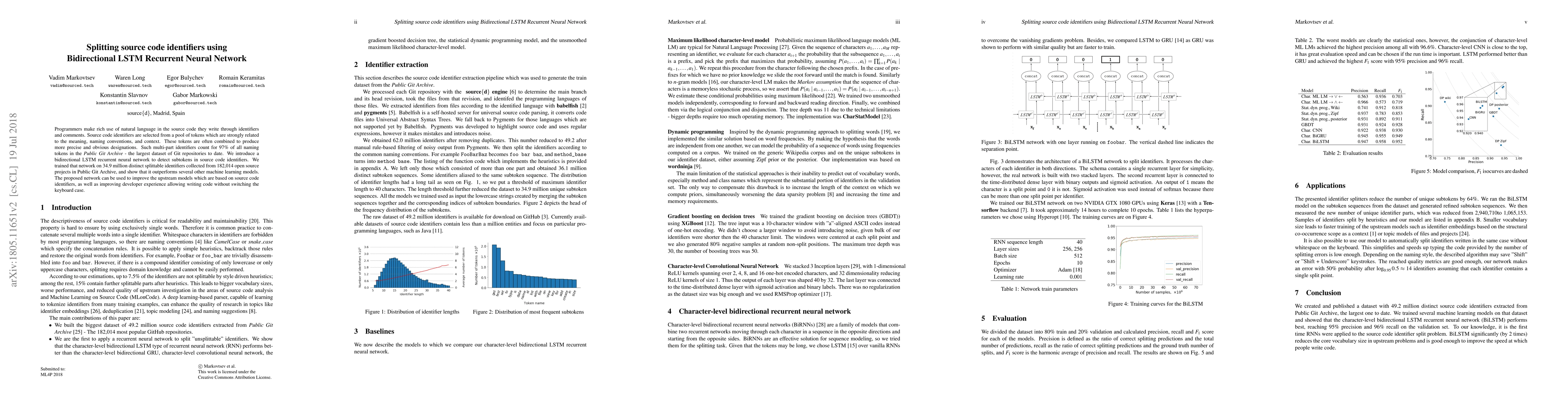 This paper introduces a bidirectional LSTM recurrent neural network to detect subtokens in source code identifiers, trained on 41.7 million identifiers from Public Git Archive. The model outperforms other machine learning techniques, potentially enhancing developer tools and experience by simplifying code writing.