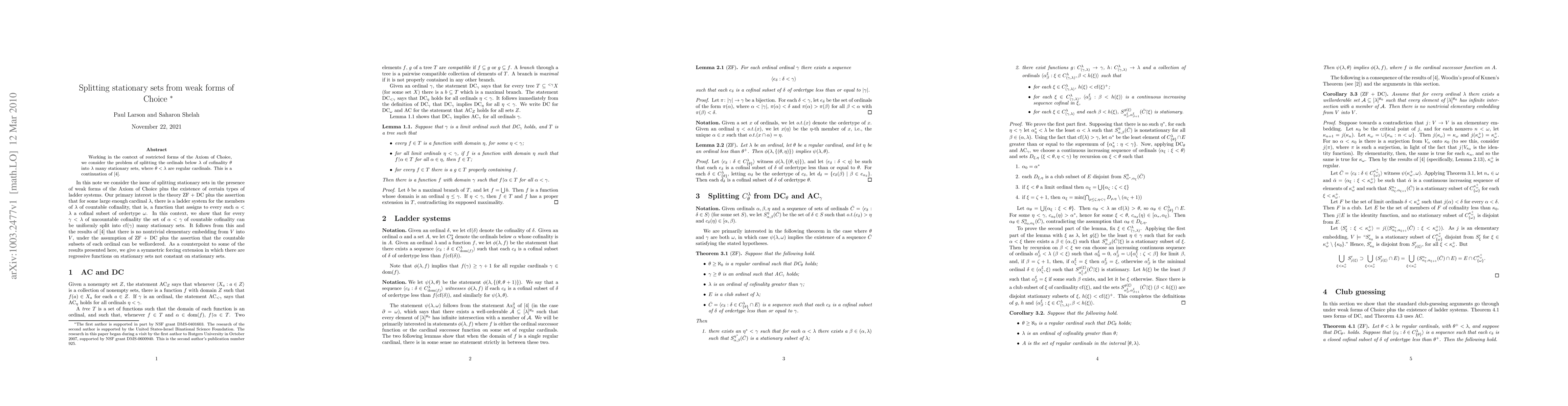 Working in the context of restricted forms of the Axiom of Choice, we consider the problem of splitting the ordinals below $\lambda$ of cofinality $\theta$ into $\lambda$ many stationary sets, where $\theta < \lambda$ are regular cardinals. This is a continuation of \cite{Sh835}.