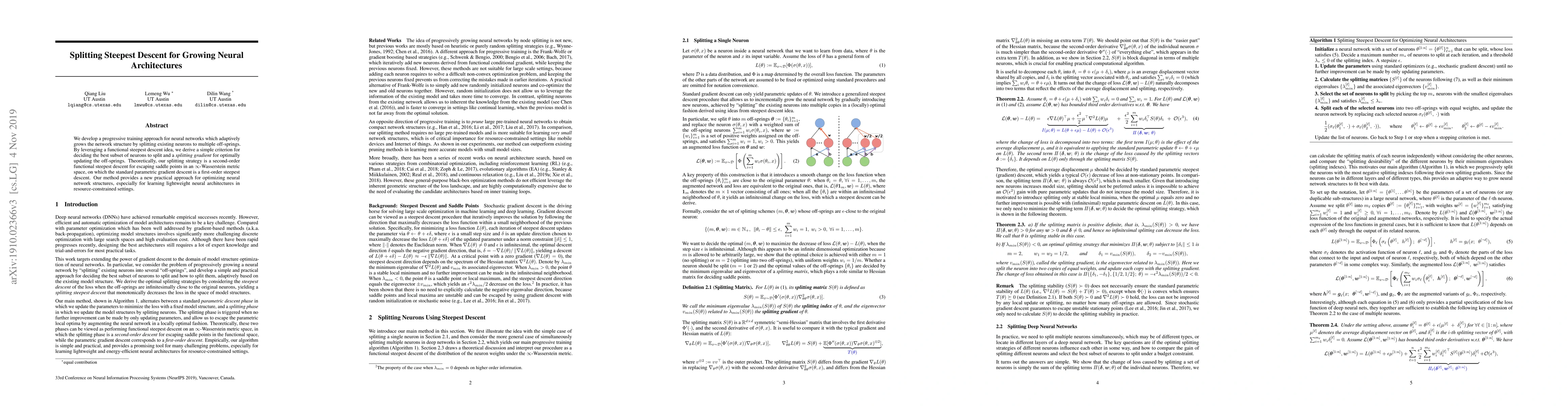 We develop a progressive training approach for neural networks which adaptively grows the network structure by splitting existing neurons to multiple off-springs. By leveraging a functional steepest descent idea, we derive a simple criterion for deciding the best subset of neurons to split and a splitting gradient for optimally updating the off-springs. Theoretically, our splitting strategy is a second-order functional steepest descent for escaping saddle points in an $\infty$-Wasserstein metric space, on which the standard parametric gradient descent is a first-order steepest descent. Our method provides a new computationally efficient approach for optimizing neural network structures, especially for learning lightweight neural architectures in resource-constrained settings.