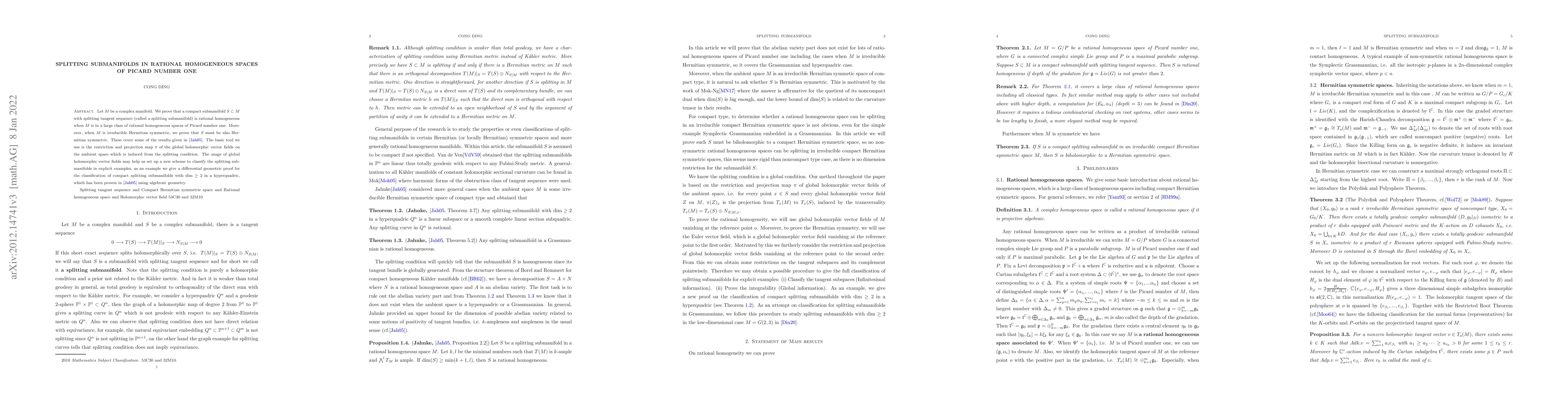 Let $M$ be a complex manifold. We prove that a compact submanifold $S\subset M$ with splitting tangent sequence (called a splitting submanifold) is rational homogeneous when $M$ is in a large class of rational homogeneous spaces of Picard number one. Moreover, when $M$ is irreducible Hermitian symmetric, we prove that $S$ must be also Hermitian symmetric. The basic tool we use is the restriction and projection map $\pi$ of the global holomorphic vector fields on the ambient space which is induced from the splitting condition. The usage of global holomorphic vector fields may help us set up a new scheme to classify the splitting submanifolds in explicit examples, as an example we give a differential geometric proof for the classification of compact splitting submanifolds with $\dim\geq 2$ in a hyperquadric, which has been previously proven using algebraic geometry.