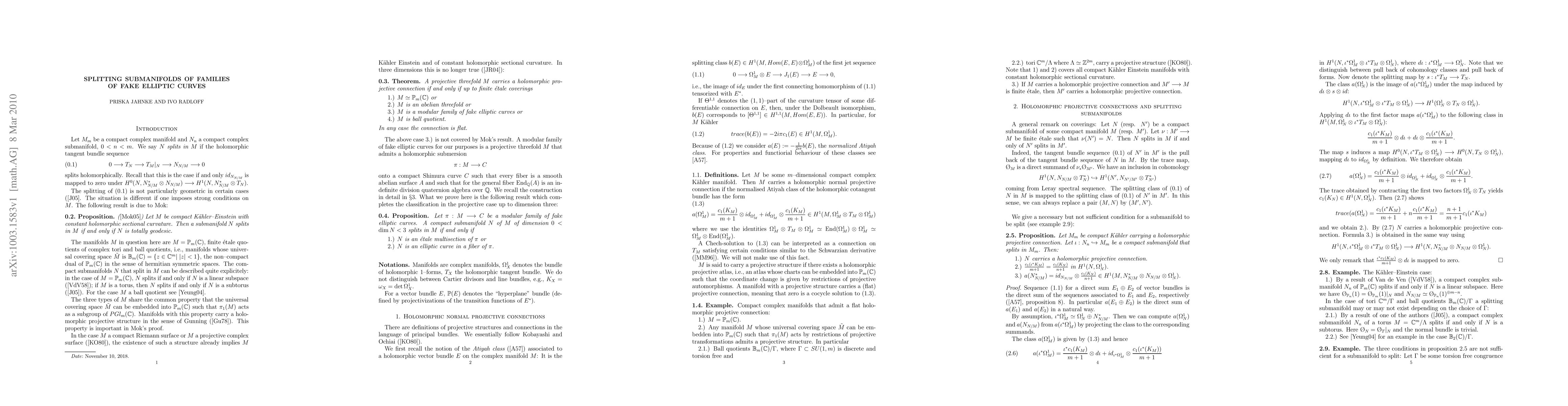 Let N a compact complex submanifold of a compact complex manifold M. We say N splits in M, if the holomorphic tangent bundle sequence splits holomorphically. By a result of Mok a splitting submanifold of a Kaehler Einstein manifold with a projective structure is totally geodesic. The classification of all splitting submanifolds of families of fake elliptic curves given here completes the case of threefolds M with a projective structure by a previous result of the authors.