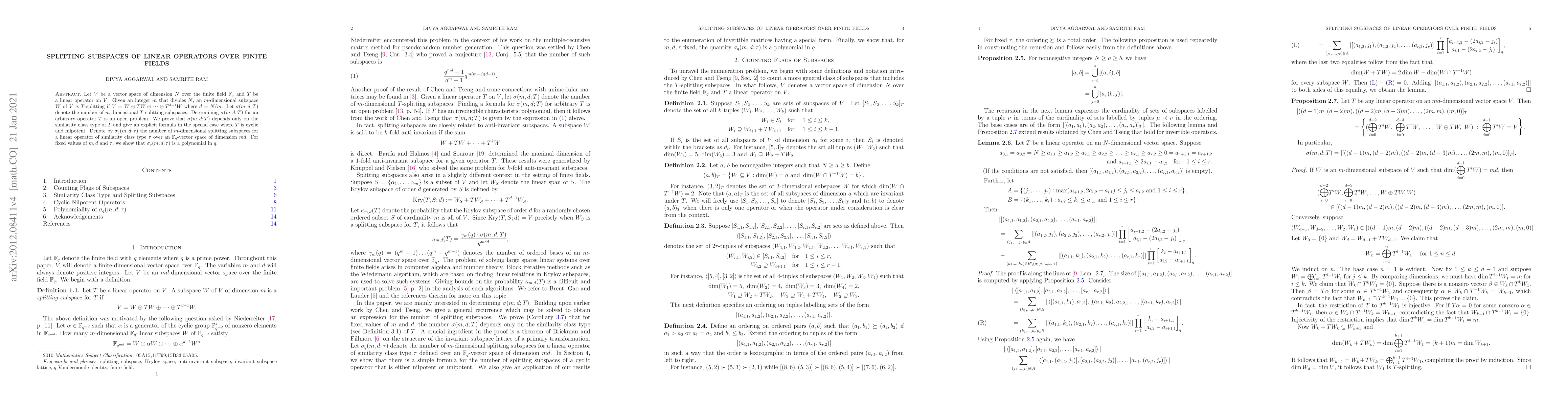 This paper explores the determination of $m$-dimensional $T$-splitting subspaces in vector spaces over finite fields, proving that the count $\sigma(m,d;T)$ depends solely on the similarity class of $T$. It provides an explicit formula for cyclic and nilpotent operators and shows that $\sigma_q(m,d;\tau)$ is a polynomial in $q$ for fixed $m, d,$ and $\tau$.