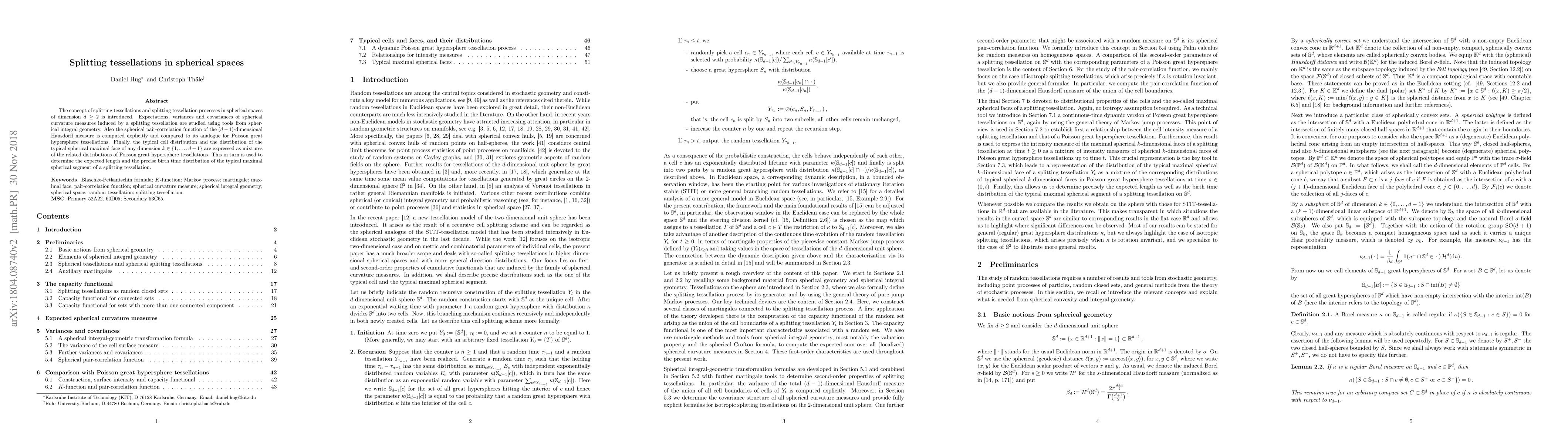 This paper introduces the concept of splitting tessellations in spherical spaces, studying their expectations, variances, and covariances using spherical integral geometry. It also computes the spherical pair-correlation function and compares it to Poisson great hypersphere tessellations, determining the typical cell distribution and birth time distribution of maximal spherical segments.