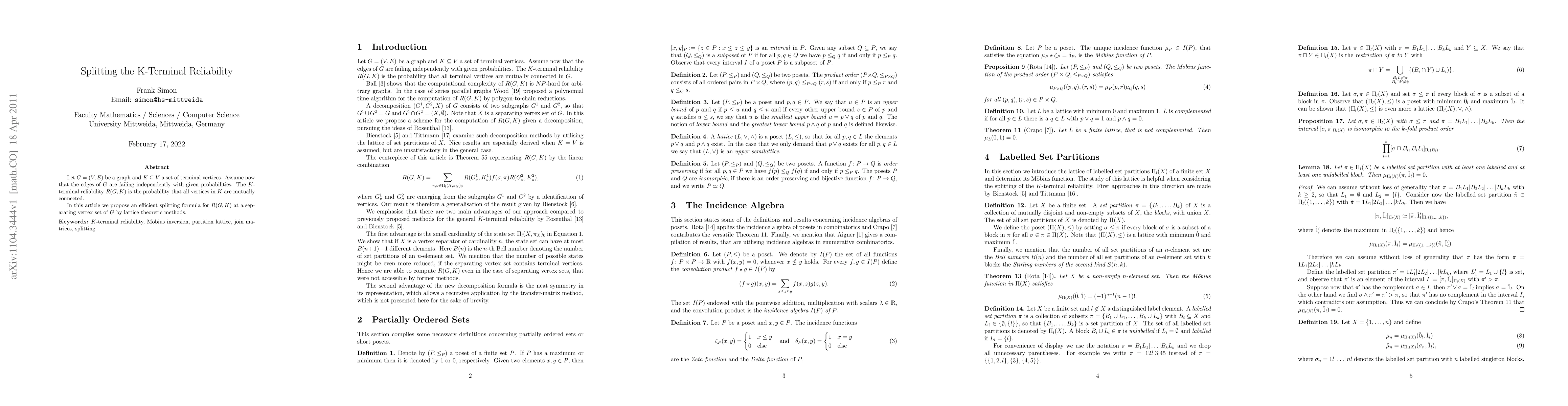 This paper proposes an efficient formula using lattice theory to split the K-terminal reliability R(G,K) at a separating vertex set in a graph, where edges fail independently with given probabilities, to compute the probability that all terminal vertices remain connected.