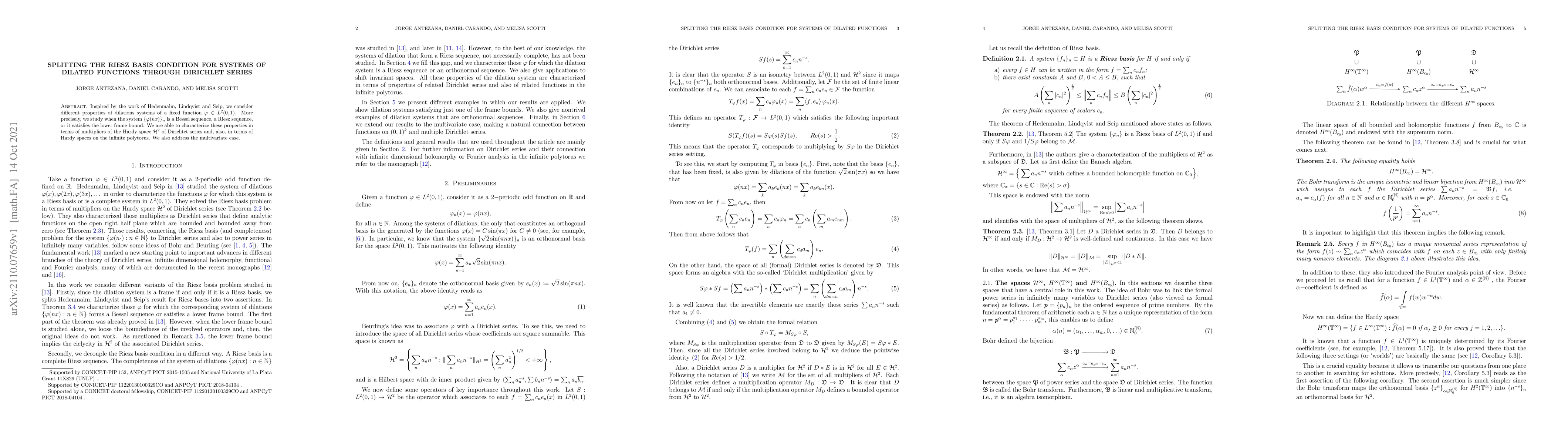 Inspired by the work of Hedenmalm, Lindqvist and Seip, we consider different properties of dilations systems of a fixed function $\varphi \in L^2(0,1)$. More precisely, we study when the system $\{\varphi(nx)\}_n$ is a Bessel sequence, a Riesz sequence, or it satisfies the lower frame bound. We are able to characterize these properties in terms of multipliers of the Hardy space $\mathcal{H}^2$ of Dirichtet series and, also, in terms of Hardy spaces on the infinite polytorus. We also address the multivariate case.