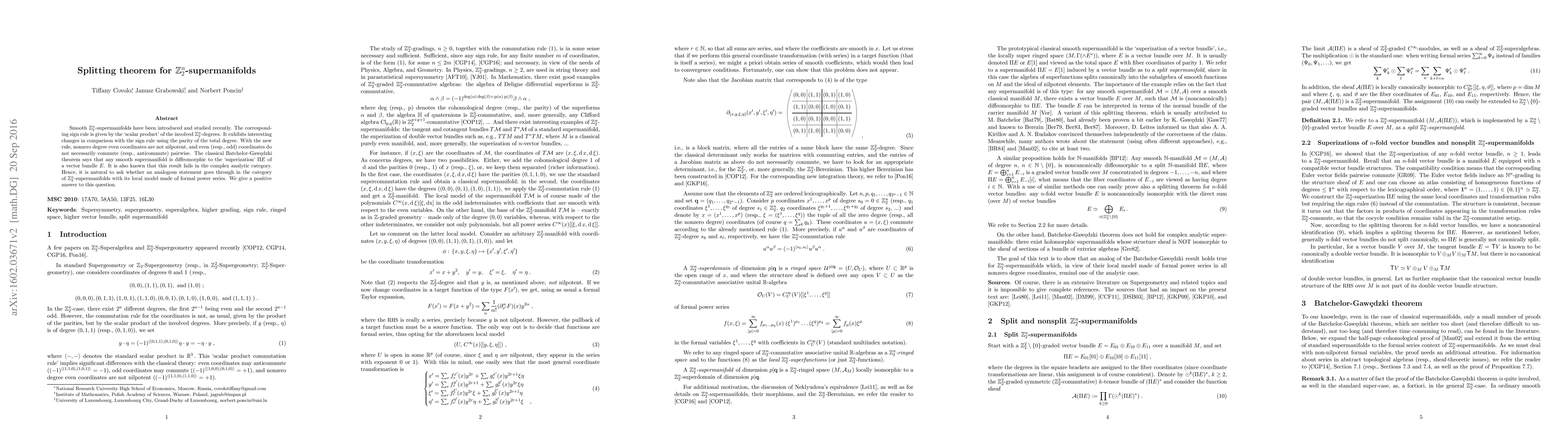 The paper proves a splitting theorem for smooth $\mathbb{Z}_2^n$-supermanifolds, establishing that they are diffeomorphic to the "superization" of a vector bundle, akin to the classical Batchelor-Gawcedzki theorem but adapted to the $\mathbb{Z}_2^n$-degree structure, which includes a novel sign rule differing from traditional parity rules.