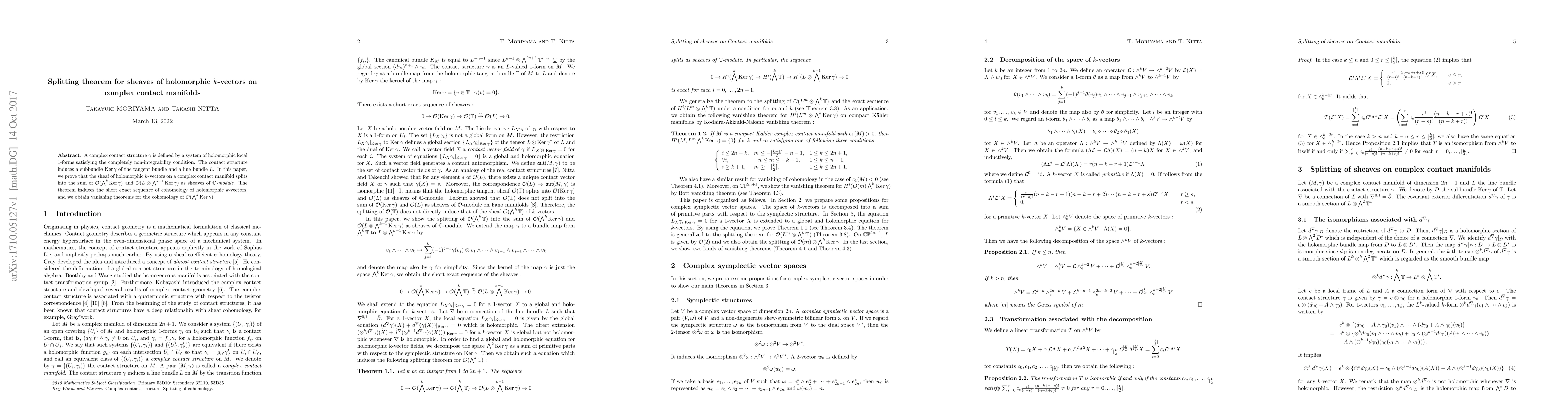 A complex contact structure $\gamma$ is defined by a system of holomorphic local $1$-forms satisfying the completely non-integrability condition. The contact structure induces a subbundle ${\rm Ker}\, \gamma$ of the tangent bundle and a line bundle $L$. In this paper, we prove that the sheaf of holomorphic $k$-vectors on a complex contact manifold splits into the sum of $\mathcal{O}(\bigwedge^{k}{\rm Ker}\, \gamma)$ and $\mathcal{O}(L\otimes \bigwedge^{k-1} {\rm Ker}\, \gamma)$ as sheaves of {\it $\mathbb{C}$-module}. The theorem induces the short exact sequence of cohomology of holomorphic $k$-vectors, and we obtain vanishing theorems for the cohomology of $\mathcal{O}(\bigwedge^{k} \ker \gamma)$.