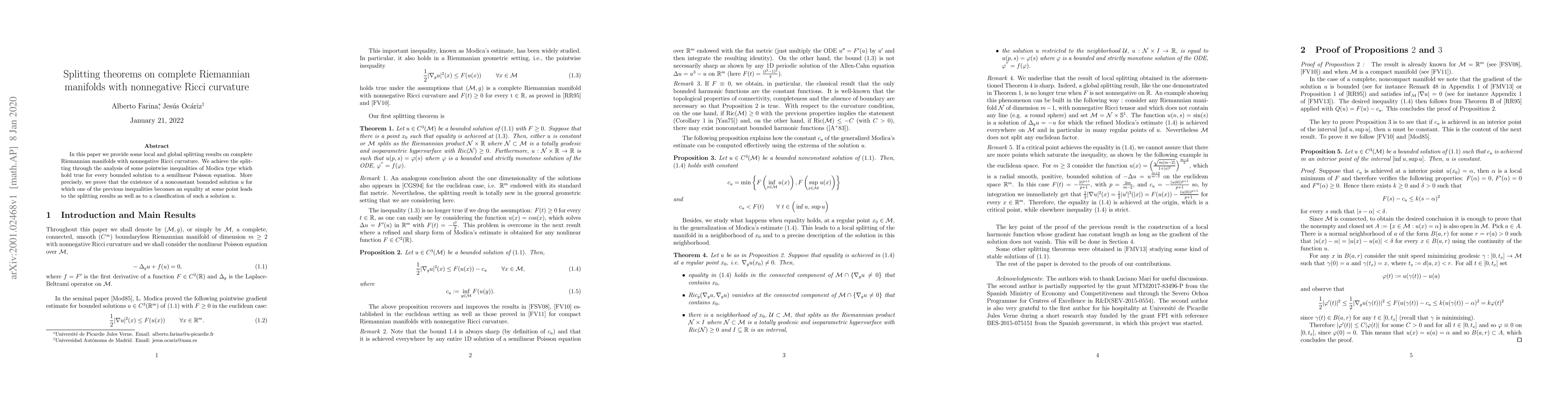 This paper presents local and global splitting results for complete Riemannian manifolds with nonnegative Ricci curvature, achieved via analysis of Modica-type inequalities for solutions to semilinear Poisson equations. The existence of a nonconstant bounded solution leading to equality in these inequalities results in splitting theorems and classification of such solutions.