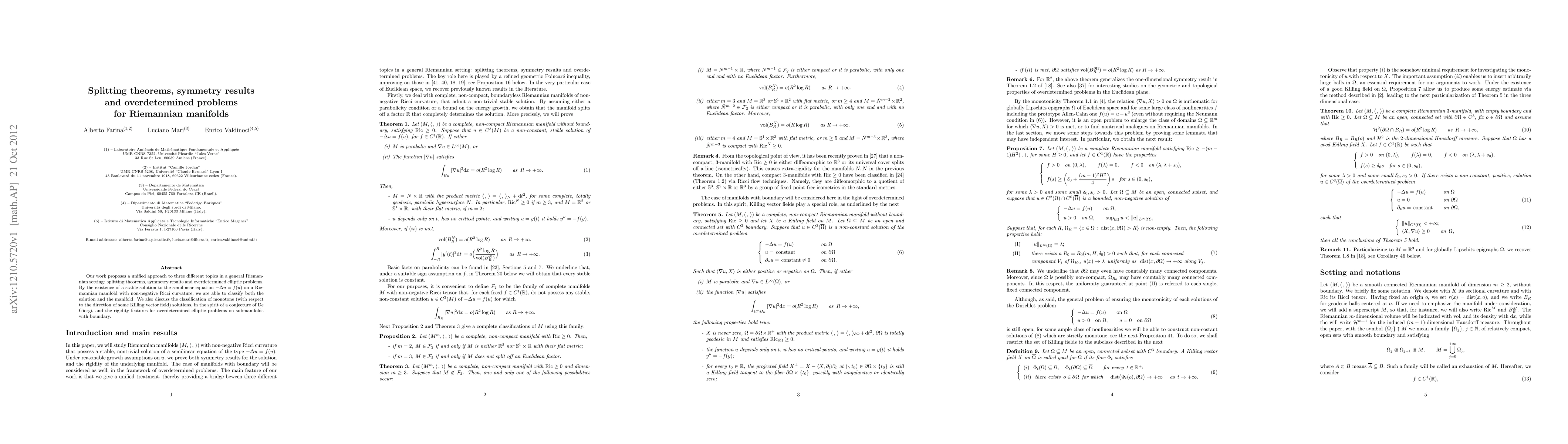 Our work proposes a unified approach to three different topics in a general Riemannian setting: splitting theorems, symmetry results and overdetermined elliptic problems. By the existence of a stable solution to the semilinear equation $-\Delta u = f(u)$ on a Riemannian manifold with non-negative Ricci curvature, we are able to classify both the solution and the manifold. We also discuss the classification of monotone (with respect to the direction of some Killing vector field) solutions, in the spirit of a conjecture of De Giorgi, and the rigidity features for overdetermined elliptic problems on submanifolds with boundary.