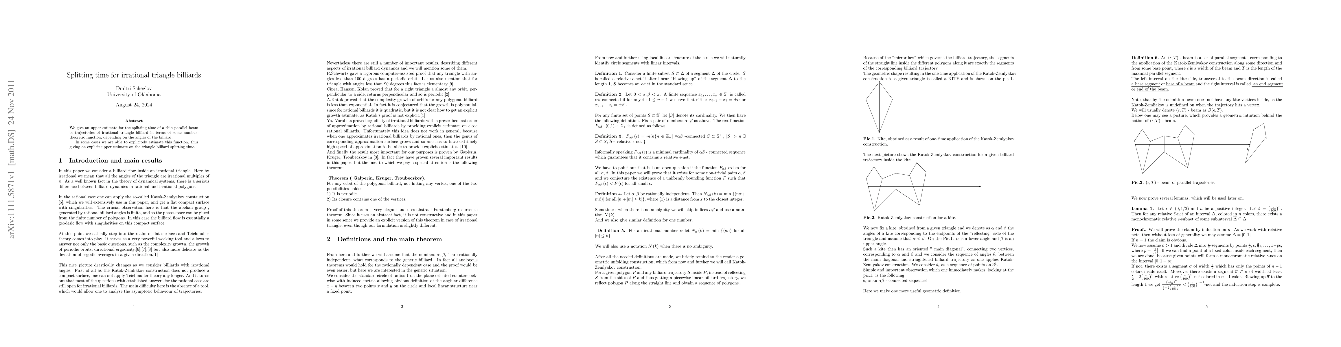 Summary: This paper establishes an upper limit for the splitting time of a thin parallel beam in irrational triangle billiards, expressed through a number-theoretic function of angles, and provides an upper estimate for this function for a specific angle class.