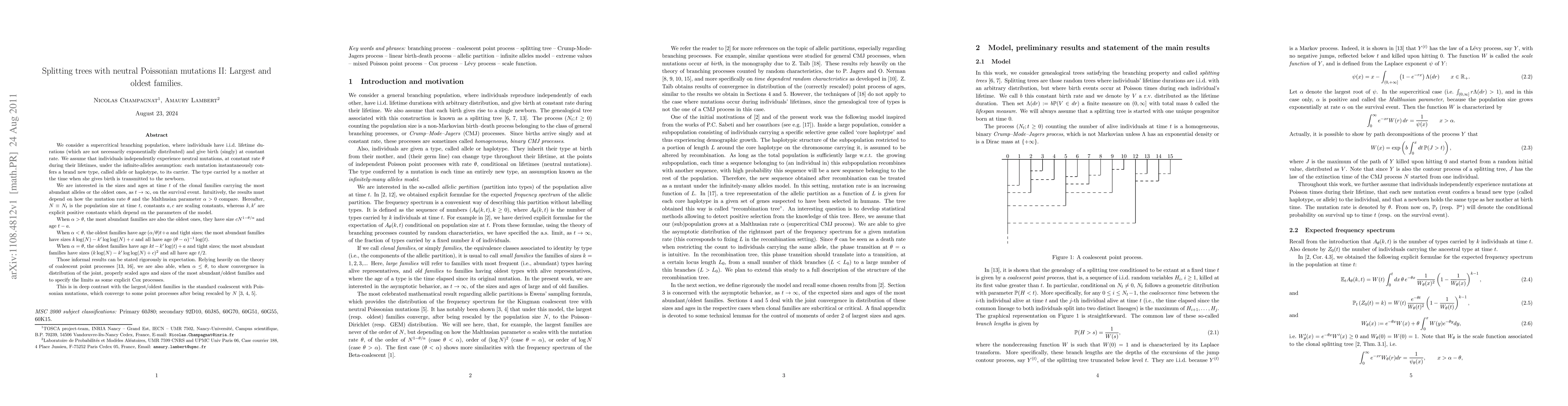We consider a supercritical branching population, where individuals have i.i.d. lifetime durations (which are not necessarily exponentially distributed) and give birth (singly) at constant rate. We assume that individuals independently experience neutral mutations, at constant rate $\theta$ during their lifetimes, under the infinite-alleles assumption: each mutation instantaneously confers a brand new type, called allele or haplotype, to its carrier. The type carried by a mother at the time when she gives birth is transmitted to the newborn. We are interested in the sizes and ages at time $t$ of the clonal families carrying the most abundant alleles or the oldest ones, as $t\to\infty$, on the survival event. Intuitively, the results must depend on how the mutation rate $\theta$ and the Malthusian parameter $\alpha>0$ compare. Hereafter, $N\equiv N_t$ is the population size at time $t$, constants $a,c$ are scaling constants, whereas $k,k'$ are explicit positive constants which depend on the parameters of the model. When $\alpha>\theta$, the most abundant families are also the oldest ones, they have size $cN^{1-\theta/\alpha}$ and age $t-a$. When $\alpha<\theta$, the oldest families have age $(\alpha /\theta)t+a$ and tight sizes; the most abundant families have sizes $k\log(N)-k'\log\log(N)+c$ and all have age $(\theta-\alpha)^{-1}\log(t)$. When $\alpha=\theta$, the oldest families have age $kt-k'\log(t)+a$ and tight sizes; the most abundant families have sizes $(k\log(N)-k'\log\log(N)+c)^2$ and all have age $t/2$. Those informal results can be stated rigorously in expectation. Relying heavily on the theory of coalescent point processes, we are also able, when $\alpha\leq\theta$, to show convergence in distribution of the joint, properly scaled ages and sizes of the most abundant/oldest families and to specify the limits as some explicit Cox processes.