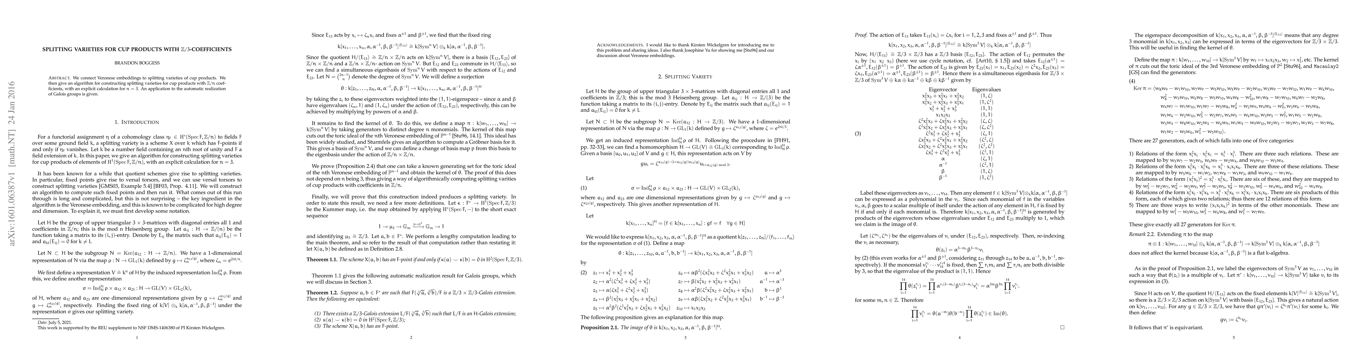 This paper links Veronese embeddings to the splitting varieties of cup products and provides an algorithm for constructing these splitting varieties with $\mathbb Z/n$ coefficients, specifically demonstrating it for $n=3$. It also applies the findings to the automatic realization of Galois groups.
