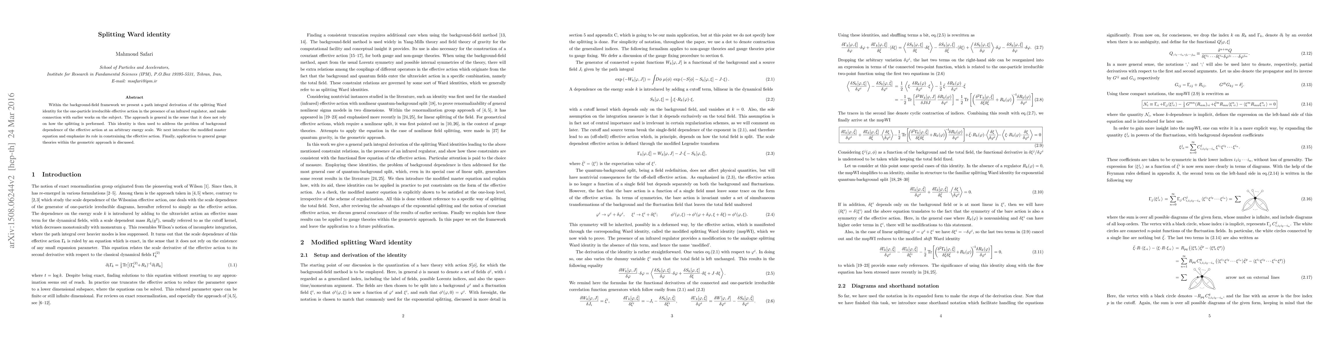 This paper derives the splitting Ward identity for the one-particle irreducible effective action using the background-field framework and an infrared regulator, establishing a general approach independent of the splitting method. It connects this identity to background dependence issues and introduces the modified master equation to constrain the effective action, with applications to general gauge theories.