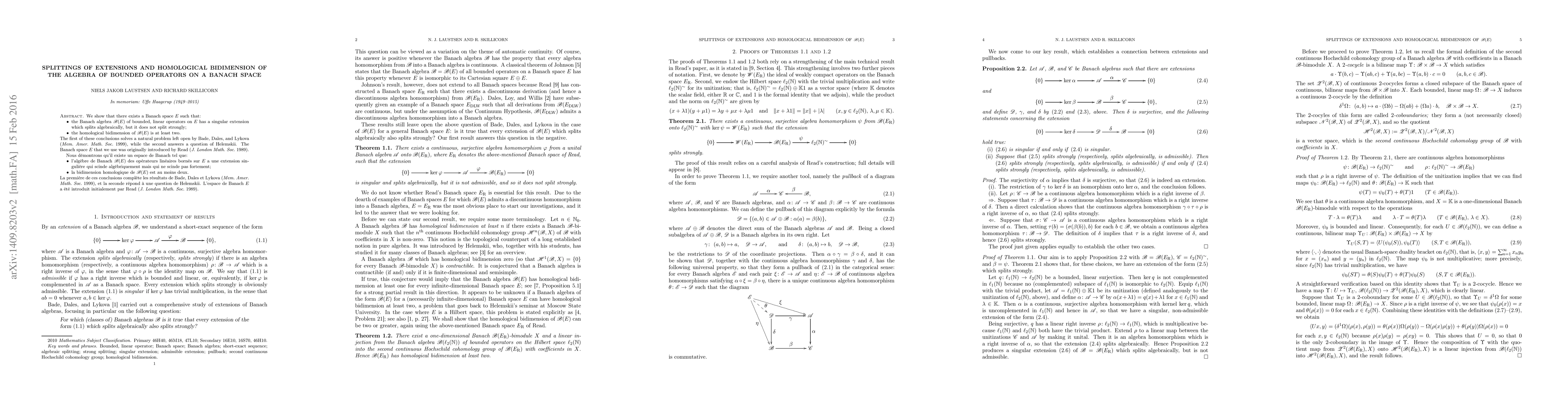 We show that there exists a Banach space $E$ with the following properties: the Banach algebra $\mathscr{B}(E)$ of bounded, linear operators on $E$ has a singular extension which splits algebraically, but it does not split strongly, and the homological bidimension of $\mathscr{B}(E)$ is at least two. The first of these conclusions solves a natural problem left open by Bade, Dales, and Lykova (Mem. Amer. Math. Soc. 1999), while the second answers a question of Helemskii. The Banach space $E$ that we use was originally introduced by Read (J. London Math. Soc. 1989).