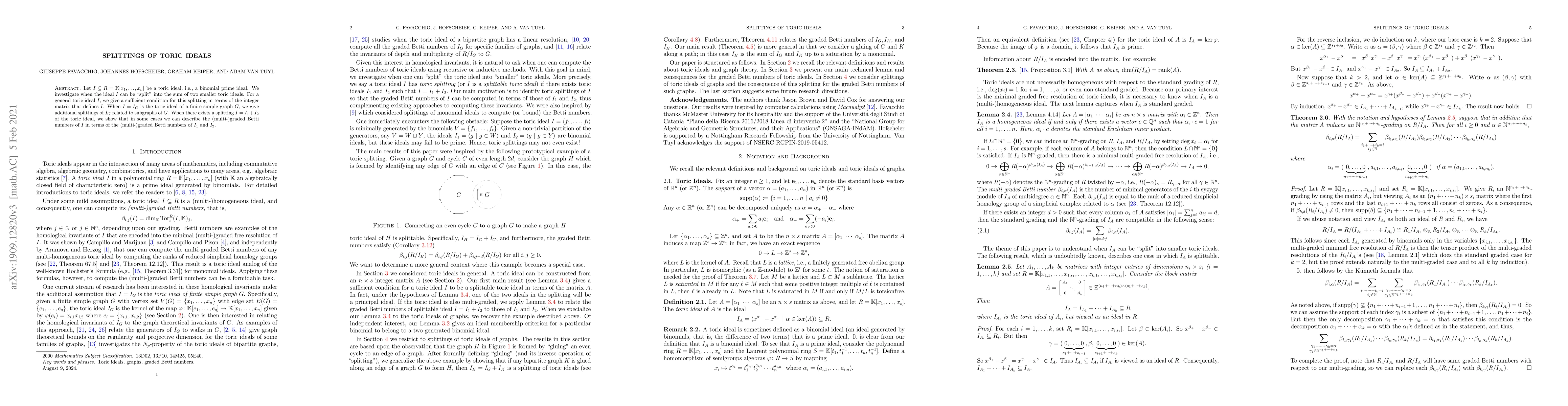 The paper introduces methods for determining when toric ideals can be split and provides explicit conditions using integer matrices, along with specific results for graph-related toric ideals.